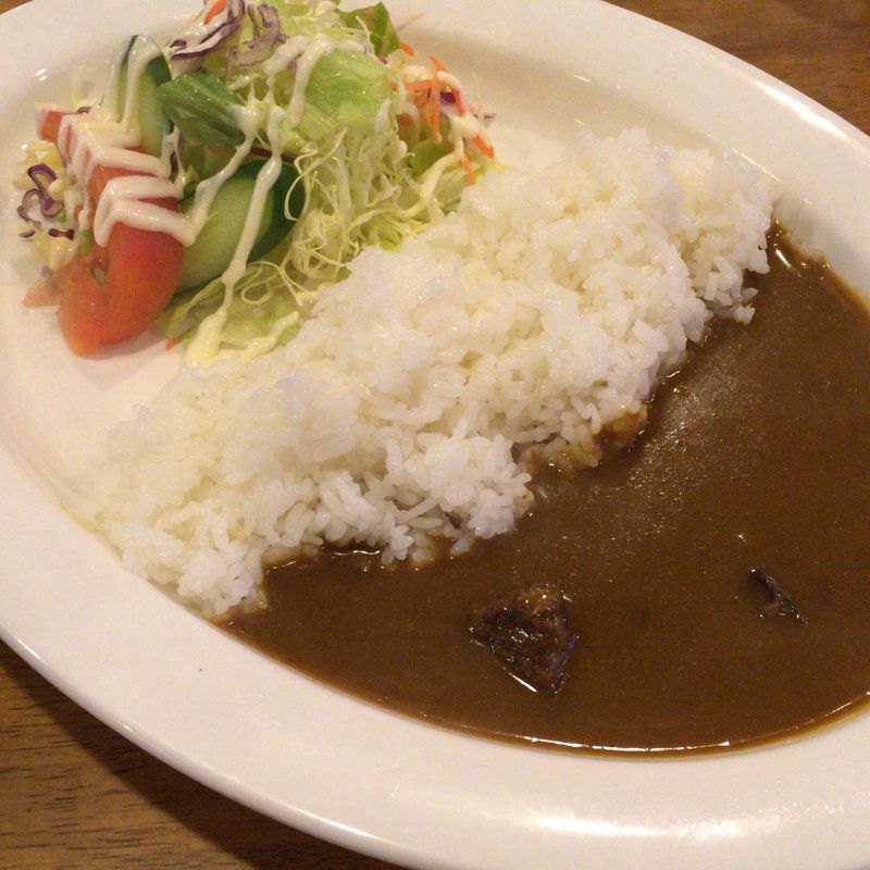 お皿の真ん中にライスをおいて、右にカレーで左にサラダ。なかなかオモロイワンプレートスタイル。辛くないカレー。辛くないけど、朝からカレー食べたら何か元気になる。