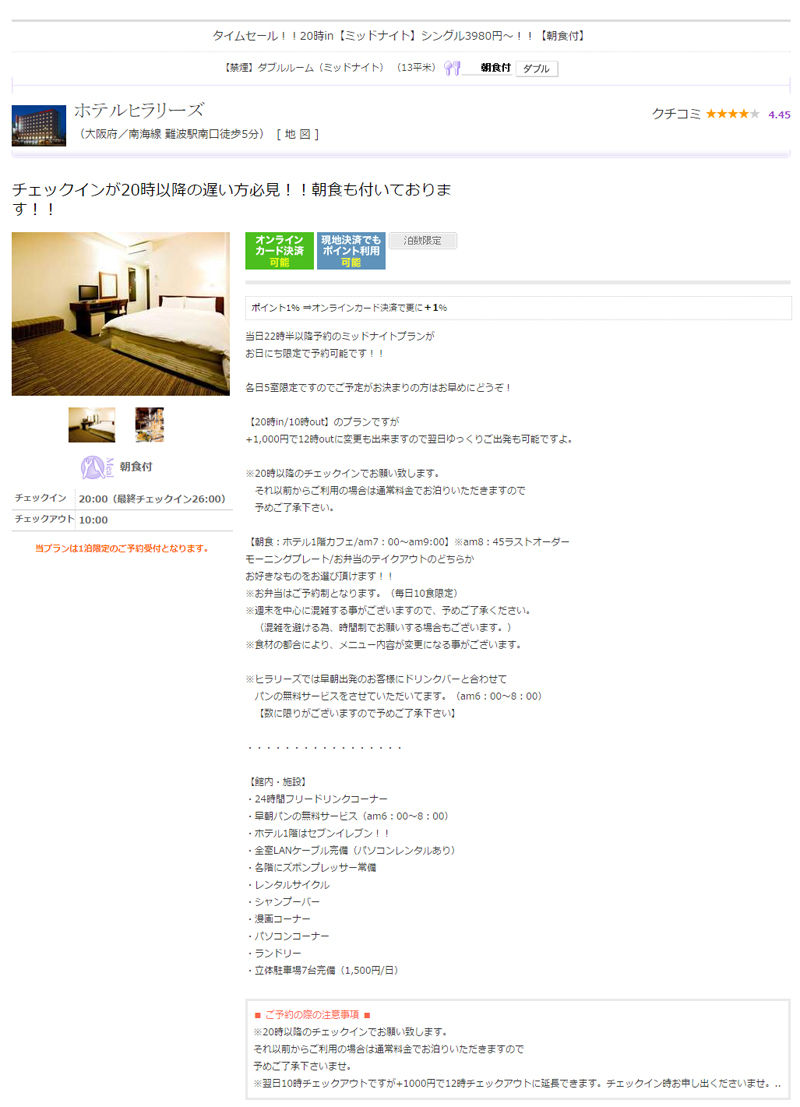 プランは『タイムセール!! 20時in【ミッドナイト】シングル3980円~!! 【朝食付】』やった。今日の宿泊価格は禁煙のダブル13平米の部屋で6,200円。2人で宿泊してもこの価格。チェックインの時に1,000円を足したら、チェックアウトの時間を12時に変更出来た。変更やね。