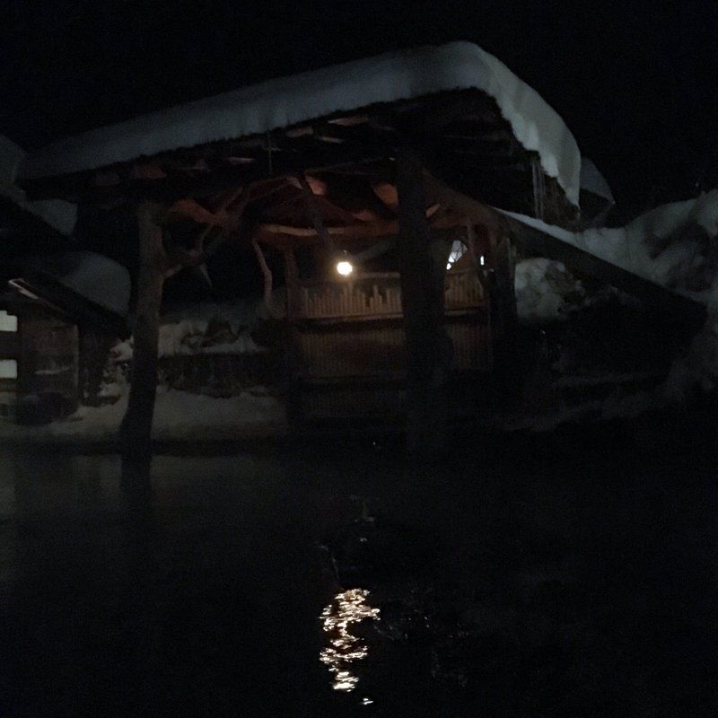 夜中でも人が少しだけいてた。男性か女性かは分からないぐらい暗い。温泉の温度は相変わらず低いんで、ずっと入ってる事が出来る。雪も降ったり止んだり。お月さんが少しだけ見える瞬間もあった。