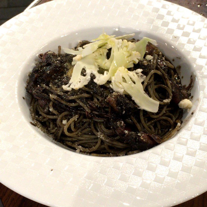軽く白ワインとピザとパスタを注文。ソアヴェ・クラシコ500円、シチリアーナ580円、ホタルイカとイカスミのパスタ(スパゲッティーニ)880円。