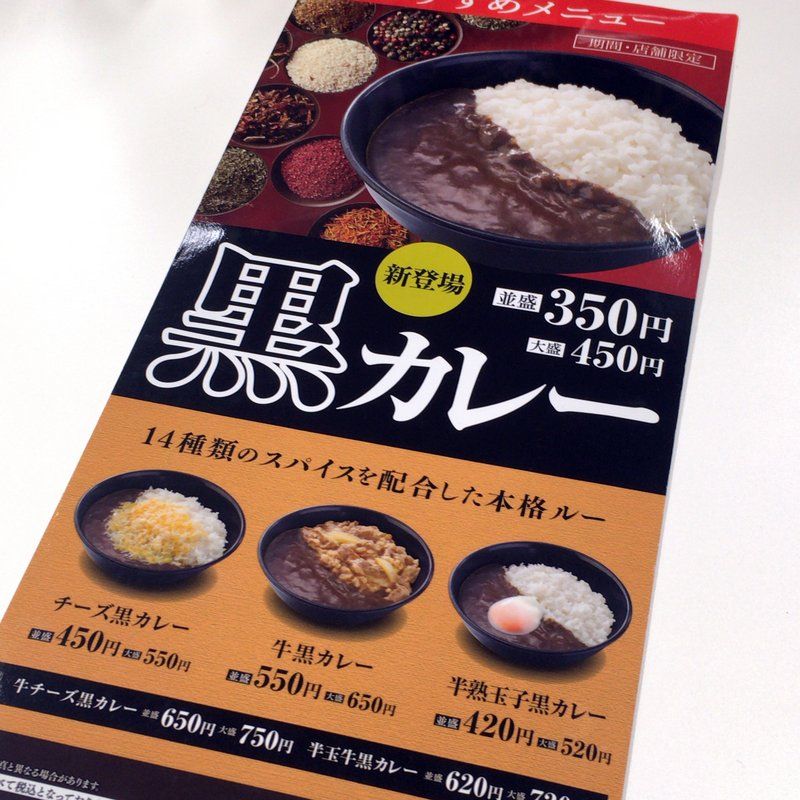 ハラへった・・・。夜中になるとハラがへるこの仕事。今日の夜食はダイダイ色の看板に突撃してみた。吉野家。ここはホンマにあちこちにあって助かる。新登場の新メニュー黒カレー大盛り450円&けんちん汁160円&ごぼうサラダ130円を注文。