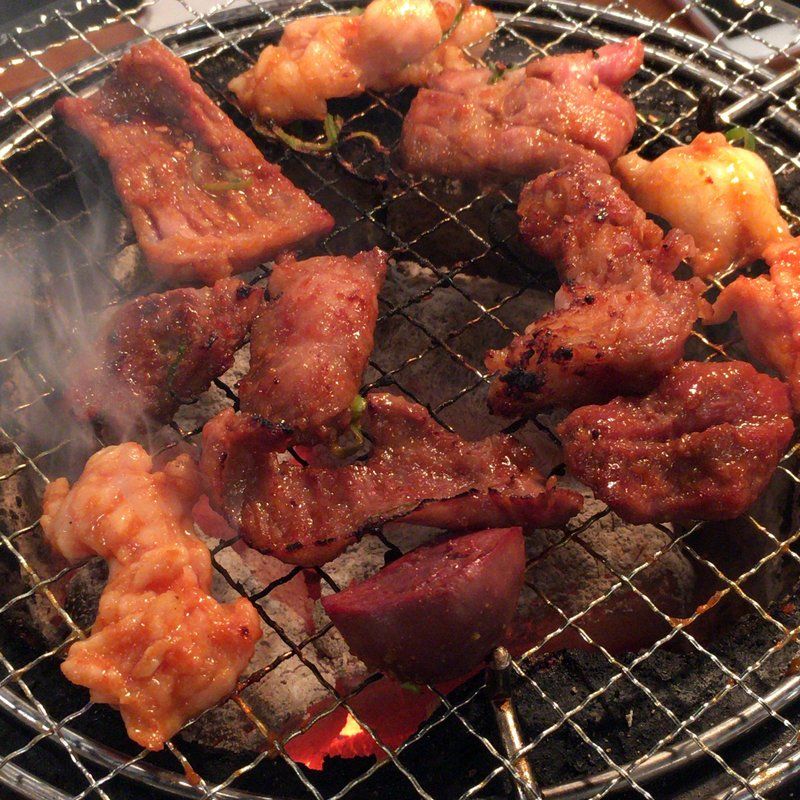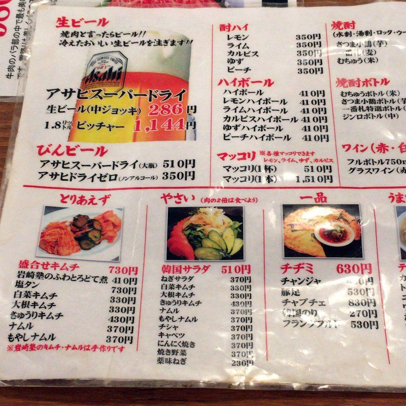 注文したのはホルモン盛合せ1kg2,030円と生ビール286円。それとキムチ盛合せ730円。ホルモンがボウルに入って出てきた。凄いインパクト。これ2,030円は異常に安い。生ビールもアサヒスーパードライで286円。安い。炭火で煙もちゃんと吸ってくれる。家族でも手軽に行ける焼肉屋さん。