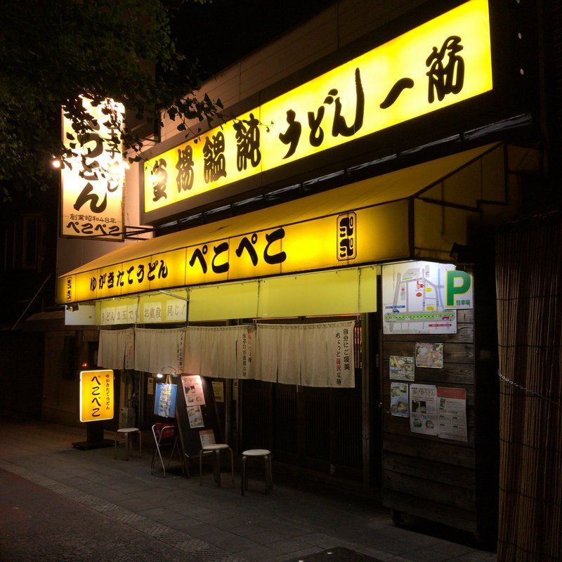 今日紹介する大阪の老舗の老舗メニューは、中央大通東向きで森ノ宮を過ぎてちょっと行ったトコで深夜営業してる湯がきたてうどんのぺこぺこ。今日は玉子とじきつねうどん900円。ダブル無料~♪