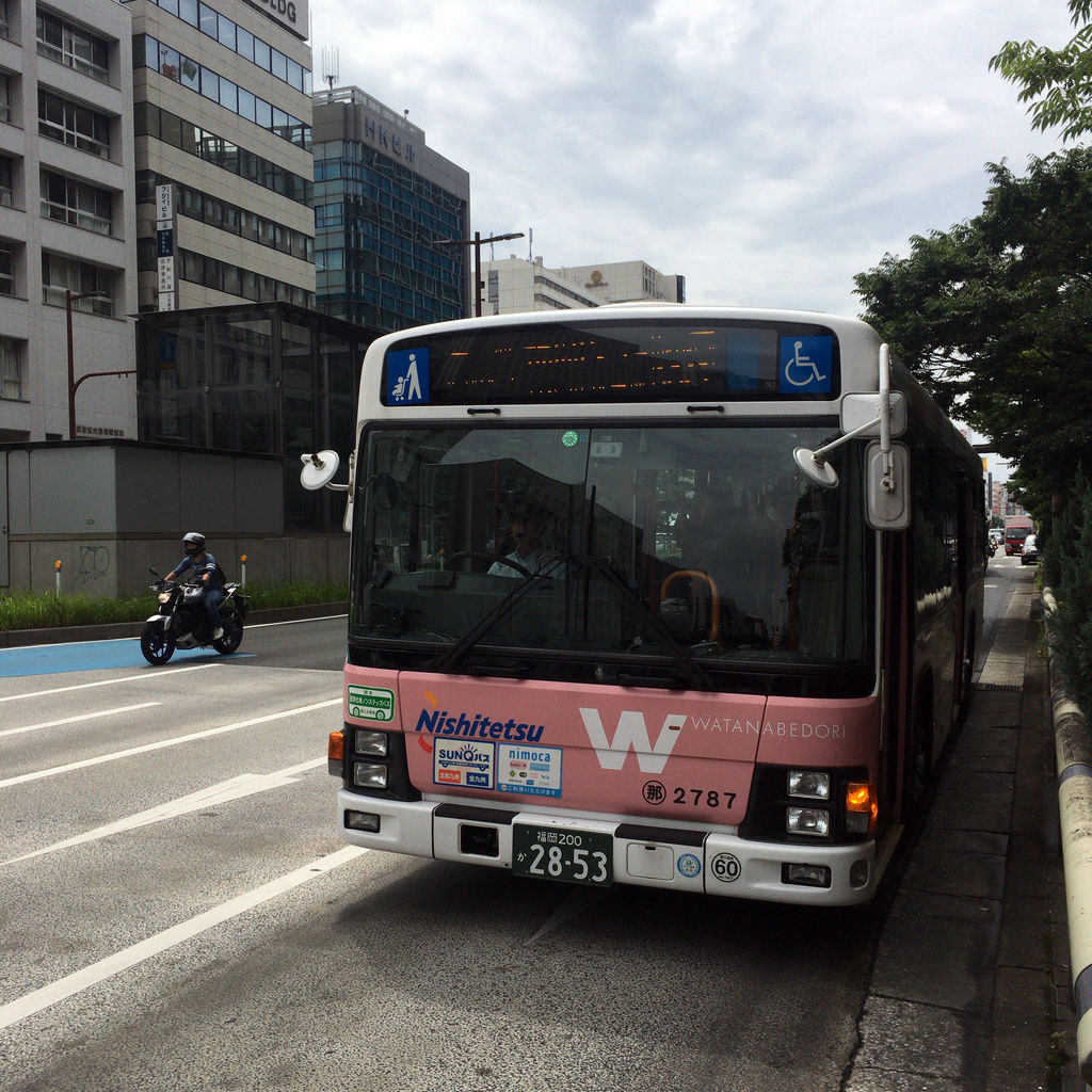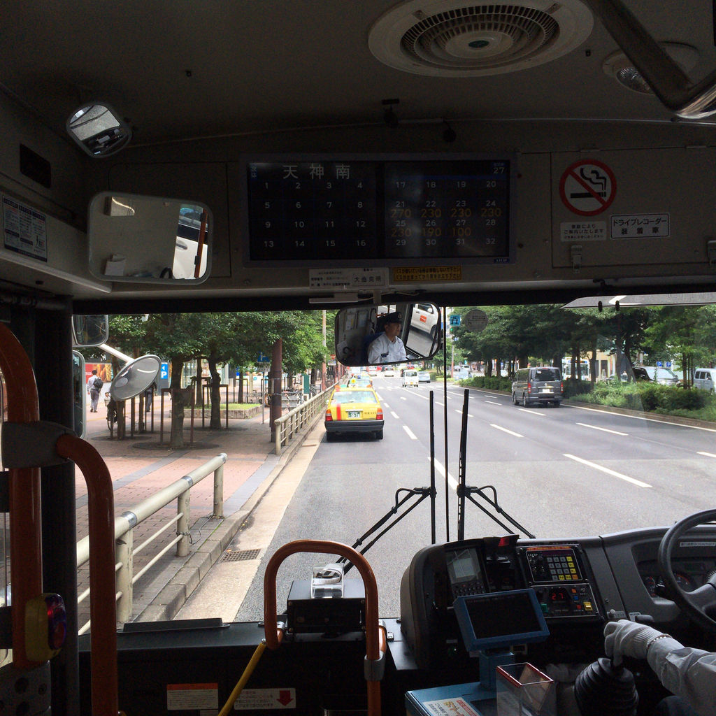 無料Wi-Fi、無料ミネラルウォーター、デスク・・・、一通り全部揃ってる。窓からの景色も悪くない。さらにバス停が近い。しかもこのバスは天神まで100円で利用出来る。色々いい感じのホテル~♪