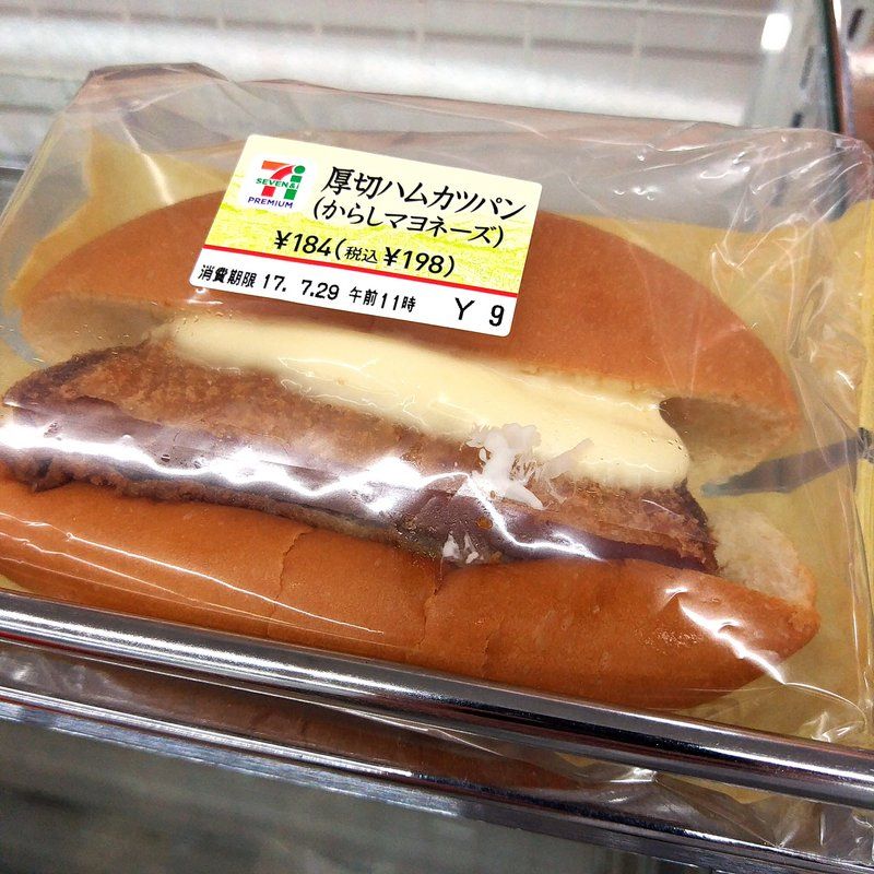 途中でハラへってセブンイレブンに寄った。パン食べたい。目が合ったのが、この厚切ハムカツパン(からしマヨネーズ)198円。この「からしマヨネーズ」という言葉の響きがタマラン♪