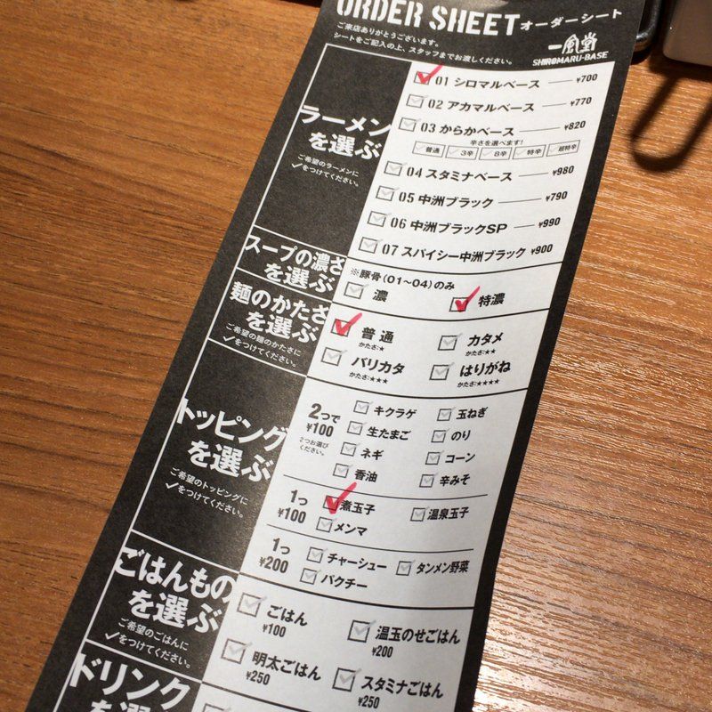 オーダーシートで好みの味を指定出来るようになってる。ポタージュスープみたいな濃厚な豚骨スープが出てきた。上手に作ってある。凄い。特濃豚骨ラーメン専門店。