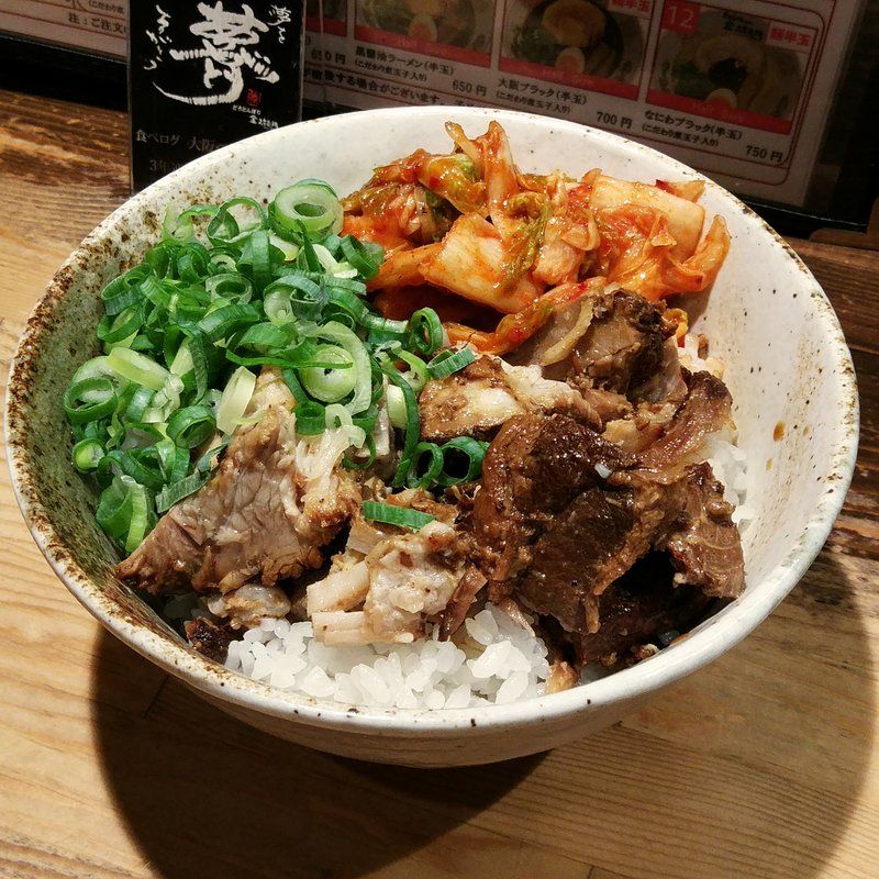 この大阪ブラックは一度試した方がいいと思う。良くできてる。大阪ブラックっていう表現も味も。店内は外国のガイドブックに載ってるせいか、外国人も多い。行列もしょっちゅう。大阪ブラックは濃いけど、意外にあっさりで太麺が合う。金醤油はあっさりしてるけど、味がある。細麺が合う。豚丼はチャーシューとキムチがいい感じ。凄いボリューム♪