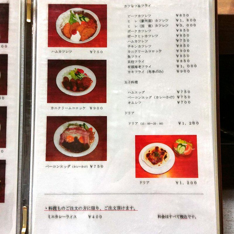 ここの洋食、実に良くできてる~!! ボリュームもあるし、いい感じ。1階がカウンター、2階は見てないけど、おそらくテーブル席。メニューの種類も多いミナミの老舗洋食屋さん。