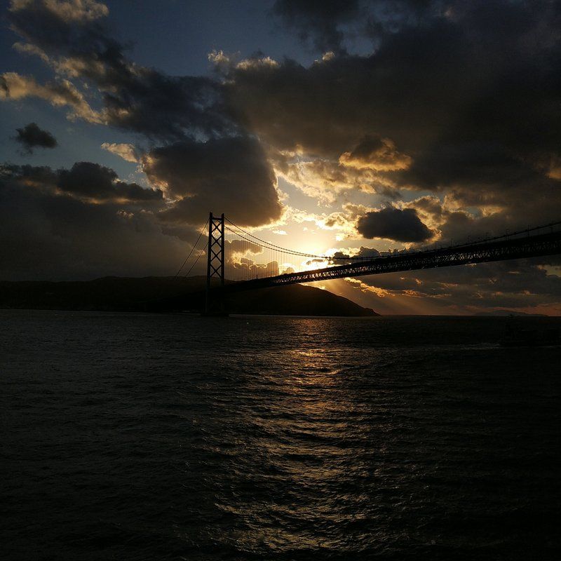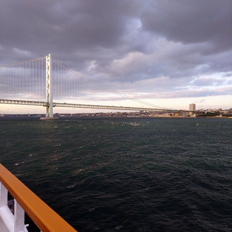明石海峡大橋をくぐる時がちょうど夕焼けで綺麗やった。しかしいかんせんデッキは寒い。またカフェに戻った。サービス中のジャックコークを注文。5,000ウォン。カプチーノとお酒が同じ値段(笑)。