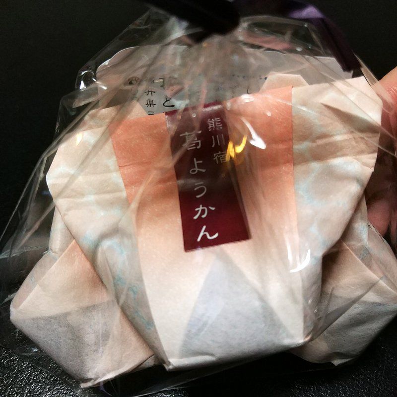 さっき道の駅三方五湖で買った葛ようかんを部屋で食べてみた。若狭鯖街道熊川宿にある葛とサバ寿司のお店まる志んっていうトコが作ってる。