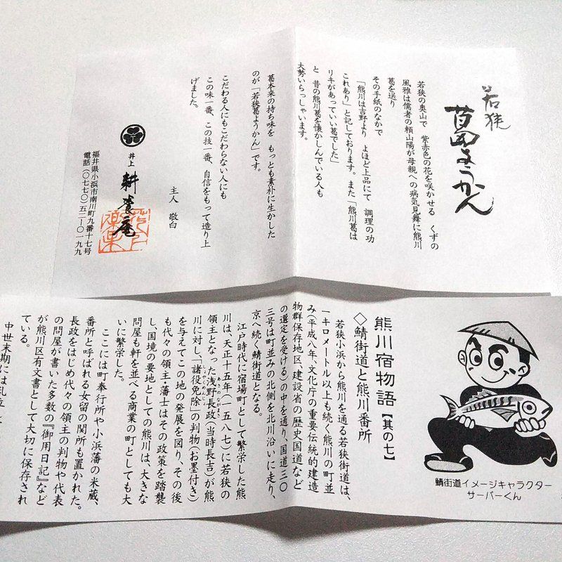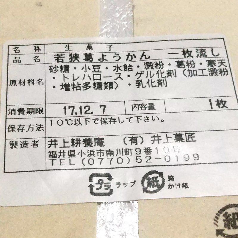 道の駅 若狭熊川宿でお土産に買った井上耕養庵の若狭葛ようかん一枚流しっていうのを試してみた。確か冷蔵庫に入ってて650円ぐらいやったと思う。裏シールの表記は生菓子になってる。要冷蔵やね。まあ寒いから大丈夫(笑)。