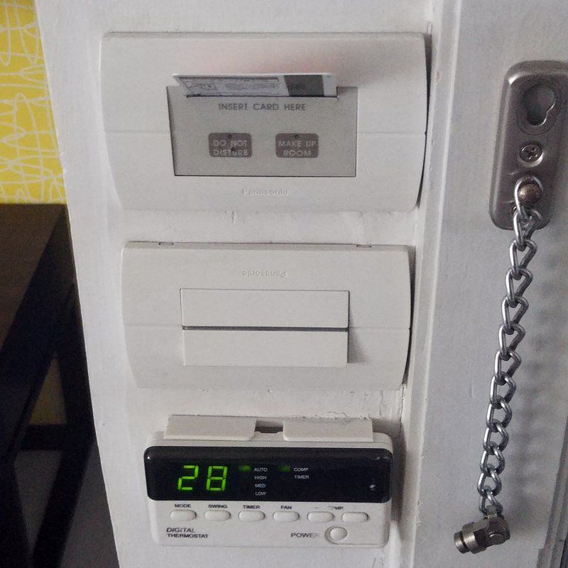 建物と設備は古そうやったけど、部屋は綺麗に掃除してあった。2階の201。ここも歯ブラシは無い。フェイスタオルが無いのも驚いた。コンプリメンタリーはミネラルウォーターが2本。シャワーの湯量は多くはないけど、まあ普通ぐらい。