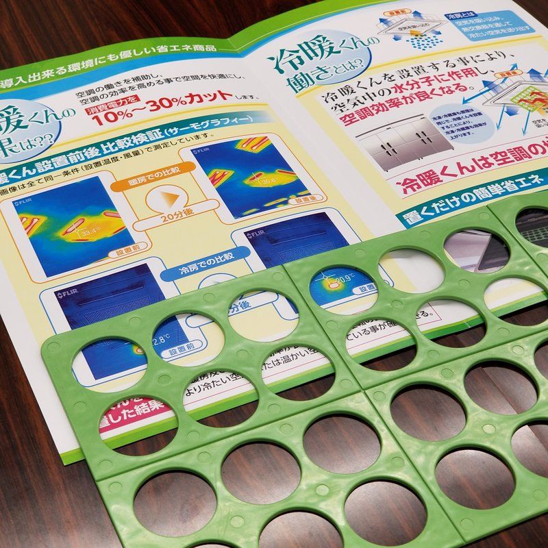 今日の打ち合わせ先のテーブルにたまたまこの冷暖くんの案内が置いてあった。何これ??っていうカンジで聞いてみたら、これをエアコンに挟むだけで、エアコン代が10~30%下がるらしい。タクシー会社の事務所も24時間営業やと思うんで、良かったらどうですか??って言われた。聞いてみよう。