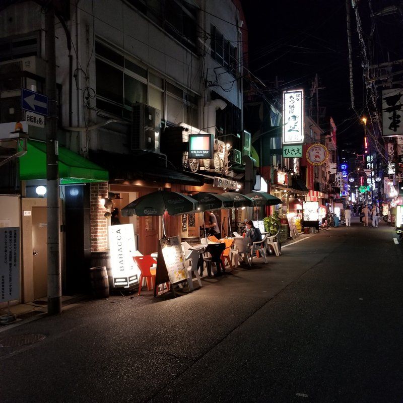 タクシードライバー希望の人と会食。1軒目に行ってみたのは裏なんばにあるイタリアンバール バラッカ。ちょうどオモテのテラス席が空いてたんで、そこに座ってみた。この季節はオモテのテラスがサイコーやね~♪