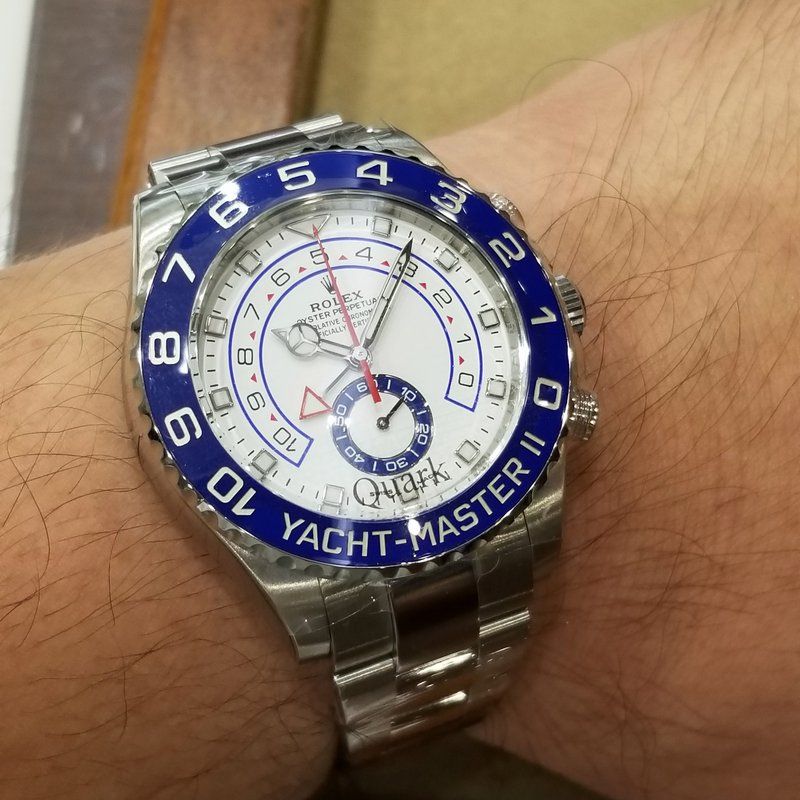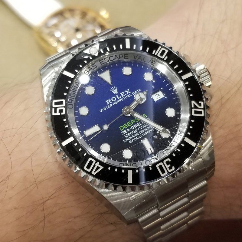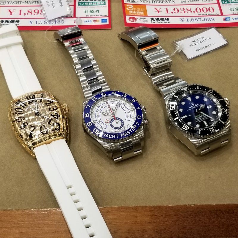 嵌めてみた。これがヨットマスター2・・・。思ってたよりも大きく無かった。今、使ってるフランクミュラーのゴールドクロコと本体は同じぐらいの大きさ。これはまあ良かった。うーん・・・って思ってたら、店員の兄さんが「今年出たこの新作のシードゥエラー ディープシーブルーはいかがでしょう」って言われて、それも持って来てくれた。