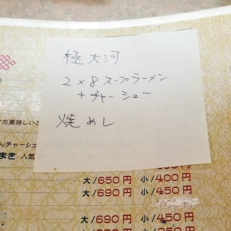 注文は紙に書いて渡すスタイル。店内は満席。ちょっと時間がかかりそう。まあいいよ。時間は大丈夫。メニューの一番上に書いてある極大河、2×8スープラーメン+チャーシュー、焼めし、そんで最後に追加で餃子。焼く寸前にネタを皮で包んでるのを見て食べたくなってんなあ。