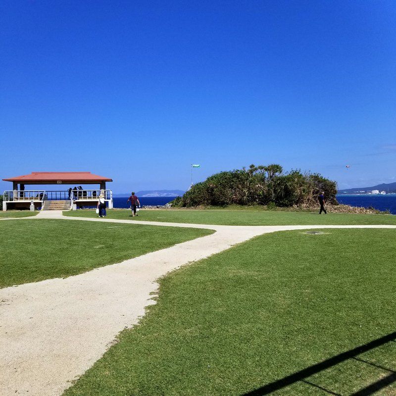 いやあ、ホンマに凄い。万座毛とはまた違った良さがある。綺麗な海が近い~!! 今日は天気はいいけど、風が強いみたいで、ダイビングは禁止されてた。風に左右されるんやね。それにしても凄い快晴。日が差すと暑い。とても10月下旬とは思えない暑さ。でも風が気持ちいい♪