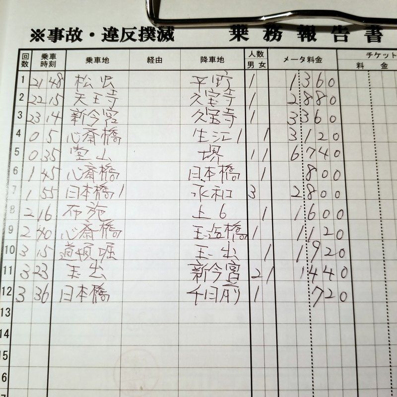 21時10分出庫で、天王寺で付け待ちしてる時に、キヨミちゃんから「天王寺電車止まった見たい大和路線」ってライン来た。ナイスーーー!!! 天王寺駅のタクシー乗り場行ったら行列が出来つつあった。すかさず乗ってもらって久宝寺まで。もう一回戻って、次は新今宮から久宝寺。こういうのがデカイ。グループラインがあると、情報共有が早い。タクシー業では大事やね。