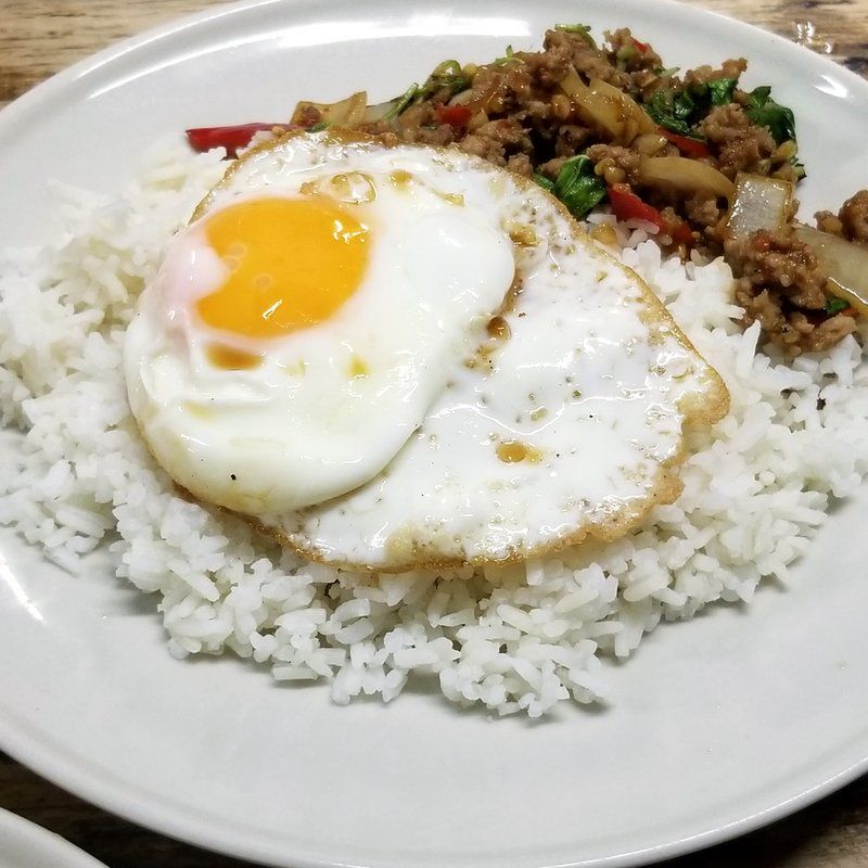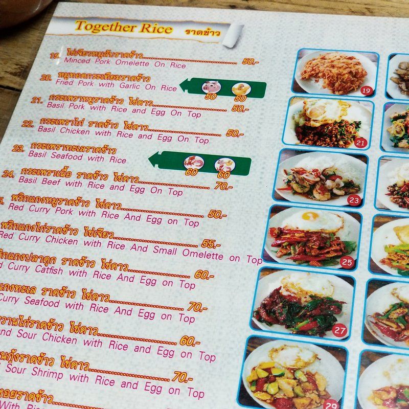 メニューにスパゲッティって書いてあって、思わず注文した。珍しいなあ。メニューの1番と21番を注文やね。それと水。メッチャうまかった。この雰囲気がそう思わせるんかもしれんけど、70バーツとか50バーツでこれだけの料理が食べれると十分やと思う。ここは辛さの調整もできる。ノースパイシーブリーズ、アリトルビットスパイスで大丈夫やった。いいお店やね。