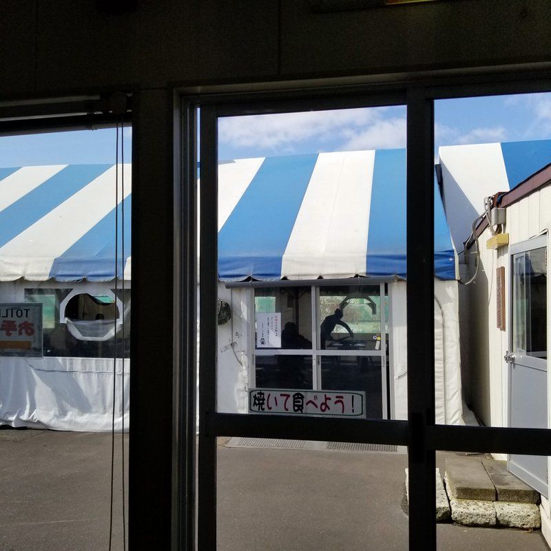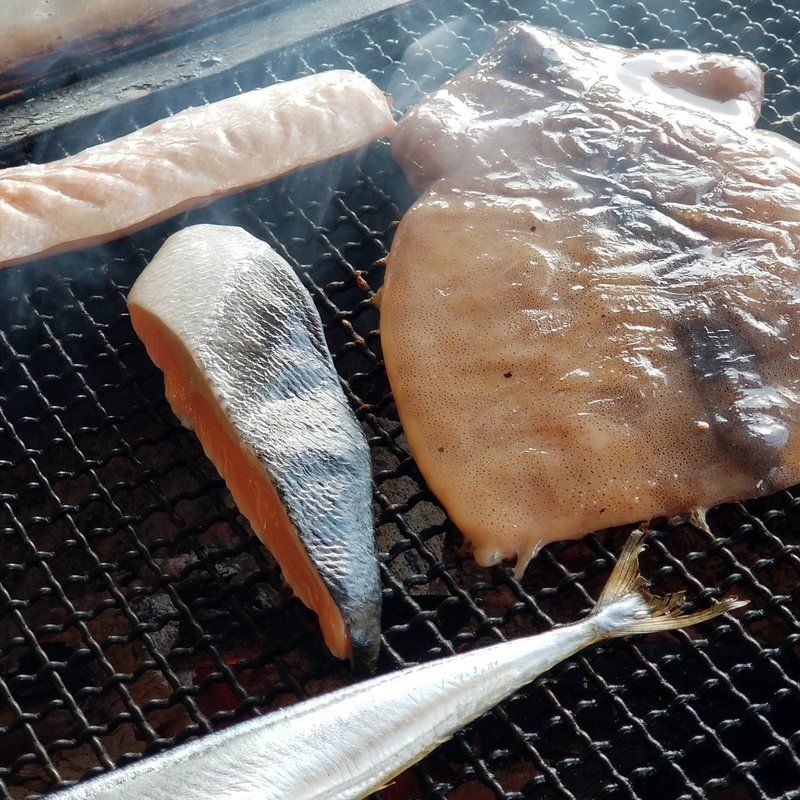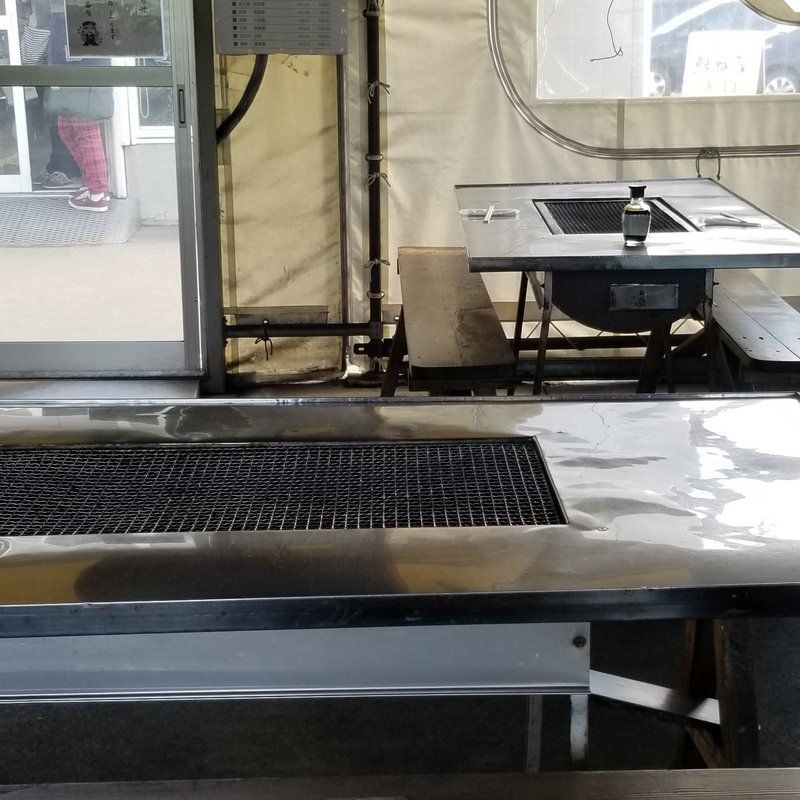 右側のお土産屋さんにもなってるお店で、まず自分が食べたい魚介を選ぶ。海鮮丼とかの注文があれば一緒にここでしておく。選んだ魚を持って、隣のテント小屋みたいなトコに行ったら、スタッフの人が焼いてくれる。