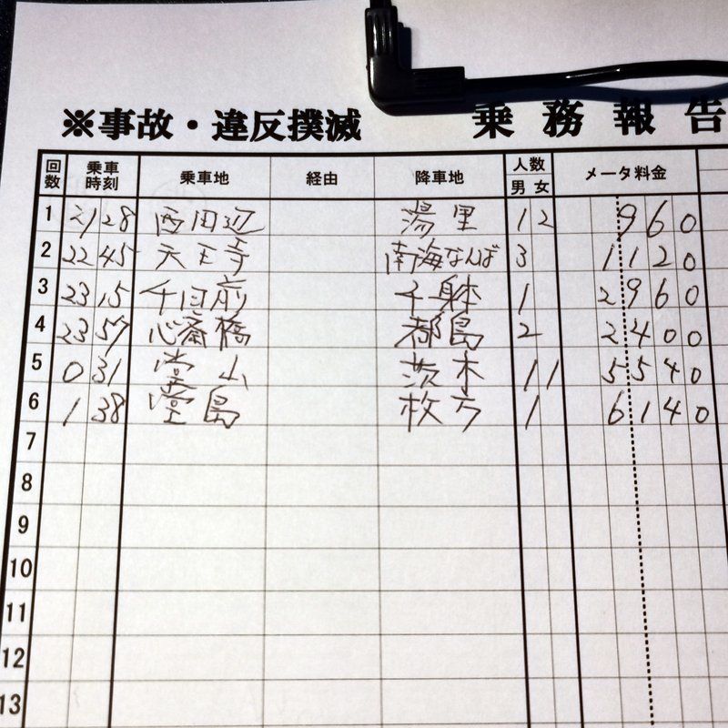 今日の売上は6組19,120円で、チップが40円やった。累計は172,580円÷6=28,763円やね。21時20分出庫で、4時40分帰庫。あかん・・・、最後の2時間パーが辛かった・・・。まあこんな日もあるのがタクシーっていう仕事やね~♪
