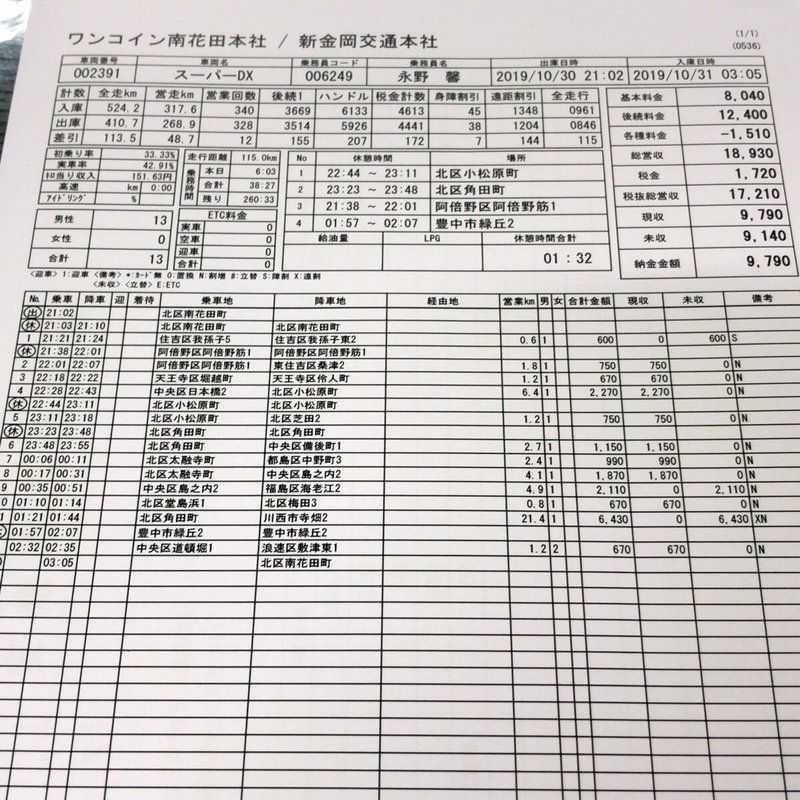 21時2分出庫、3時5分帰庫。今日はあかん。サッパリあかん。1時20分ぐらいに堂山でDiDiが鳴った。取ったら奇跡の川西。ありがとうDiDi。これがなかったら終わってた。あかん日はとっとと帰ろう。