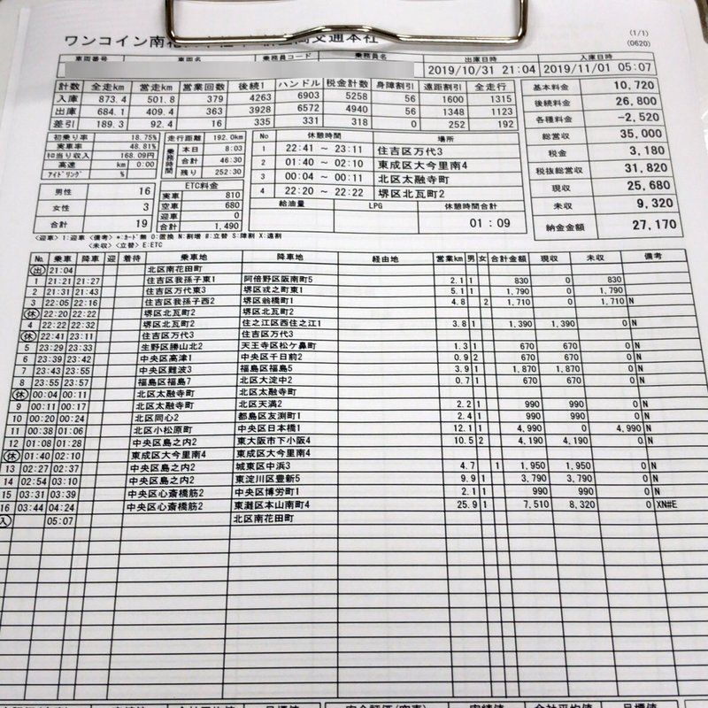 ラストのお客さんが御堂筋三津寺から神戸東灘区。これで一気に売上上がった。16組35,000円で、チップが330円やった。累計は161,890円÷7=23,127円やね。5時7分帰庫で約8時間勤務。距離運転するとやっぱり疲れるなあ~♪