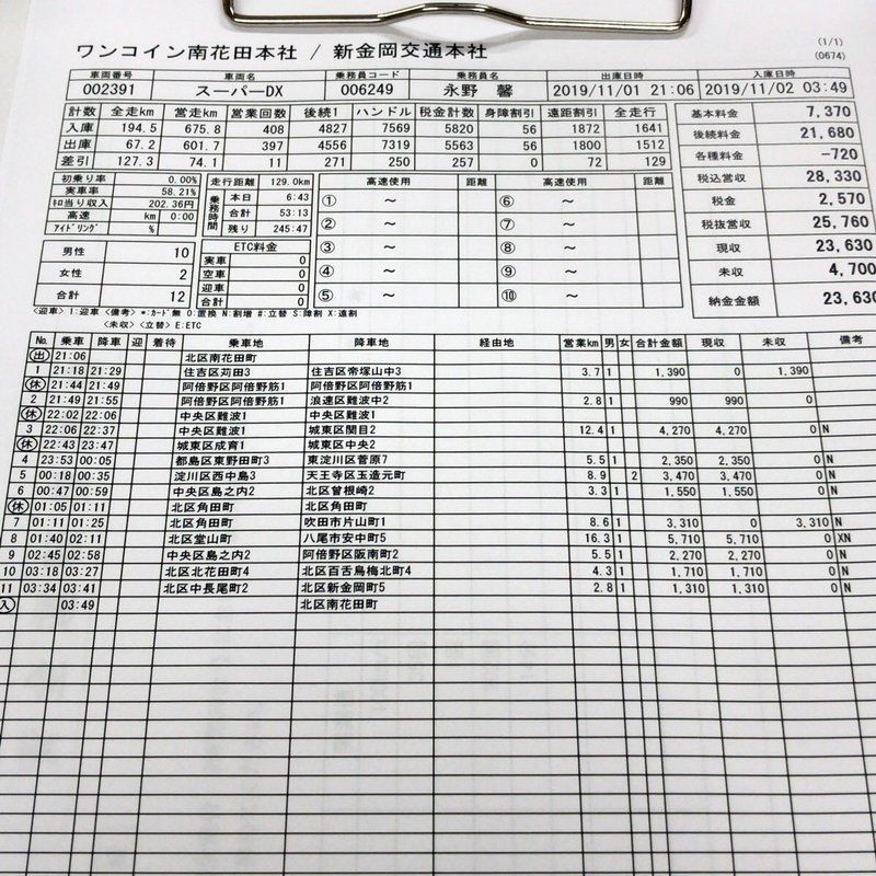 今日の売上は11組28,330円で、チップが10円やった。累計は190,220円÷8=23,777円やね。やっぱり金曜日はラクやわ。平日とは全然違う。3時49分帰庫なんで、6時間43分勤務。さ、明日も頑張っていってみよう~♪