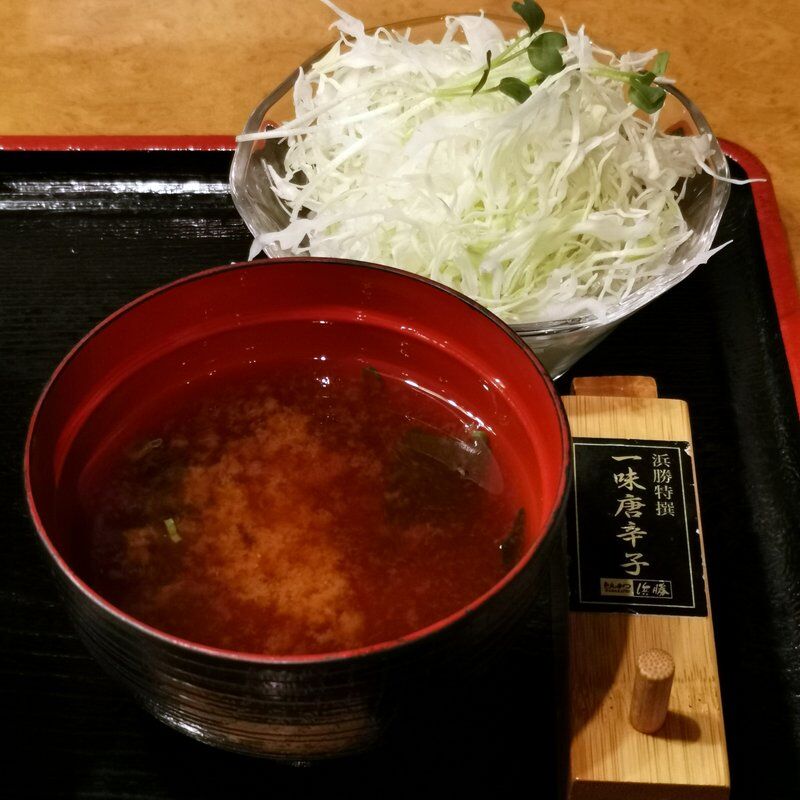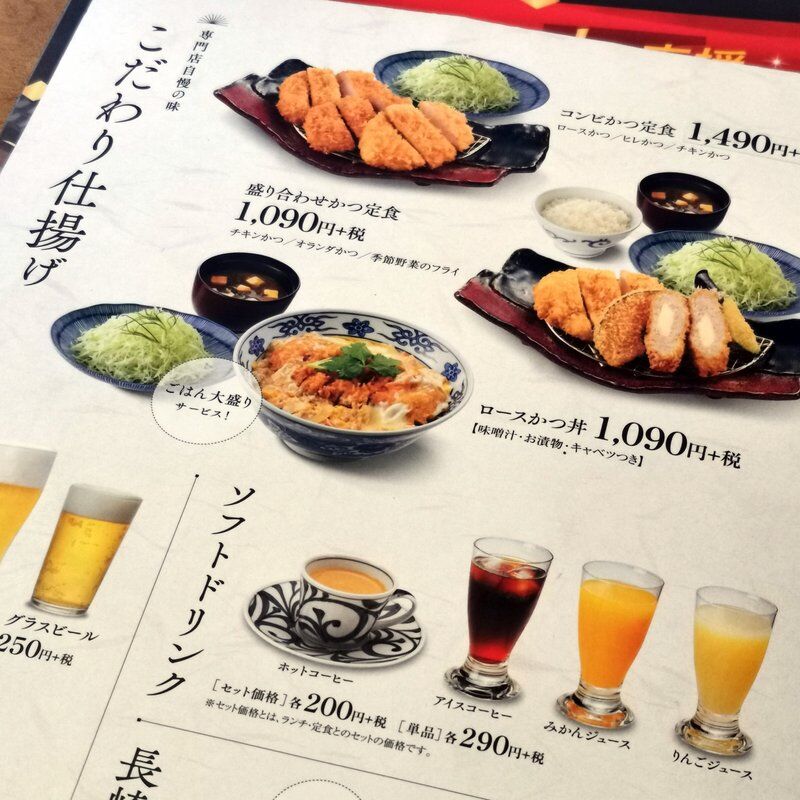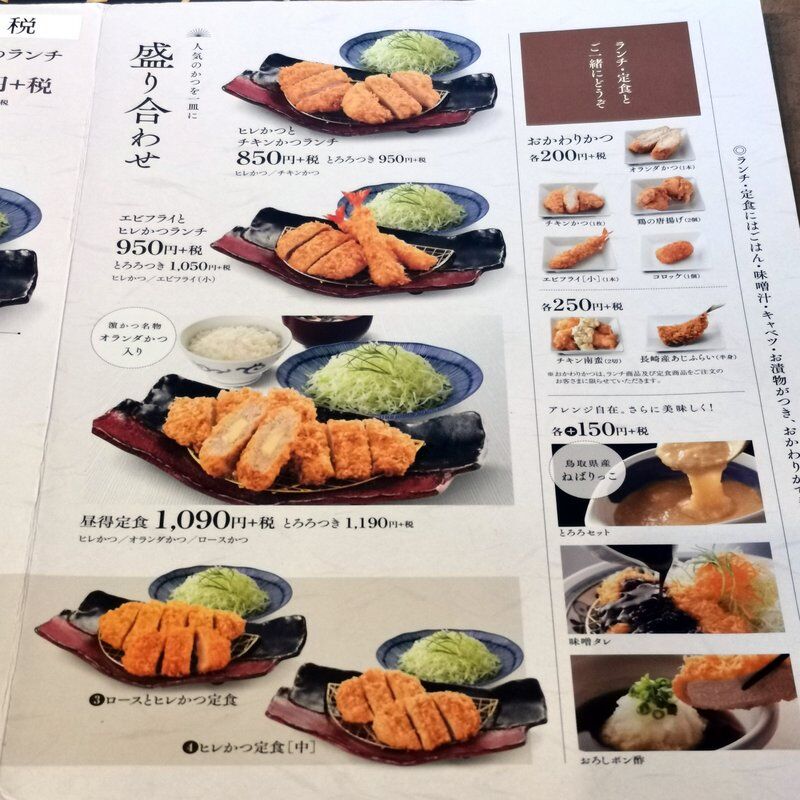 注文したのは、ヒレかつ・オランダかつ・ロースかつが入った昼得定食1,090円、さらにロースかつ丼1,090円をいっといた。ここはごはん・味噌汁・キャベツ・漬物が付いてて、全部おかわり自由というナイスサービスなお店。
