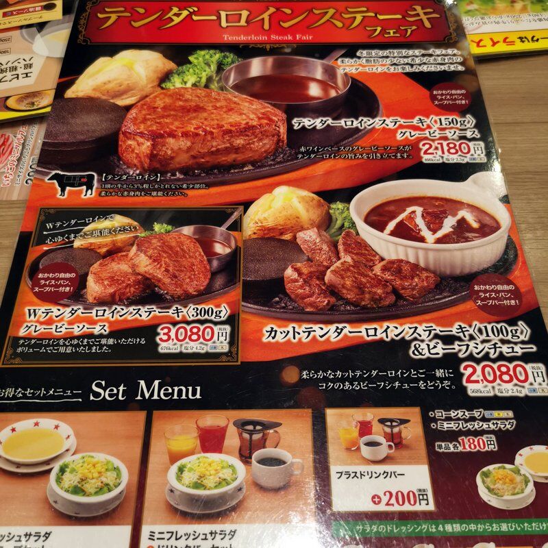 オレがエビフライ&超粗挽きハンバーグステーキ250g1,380円、娘はカットテンダーロインステーキ100g&ビーフシチュー2,080円。この超粗挽きハンバーグが箸では切りにくい。凄いわ。まさに粗挽きっていうカンジ。良くできてるなあ。日曜日なんでさすがに混んでた。娘も喜んでくれて良かった♪