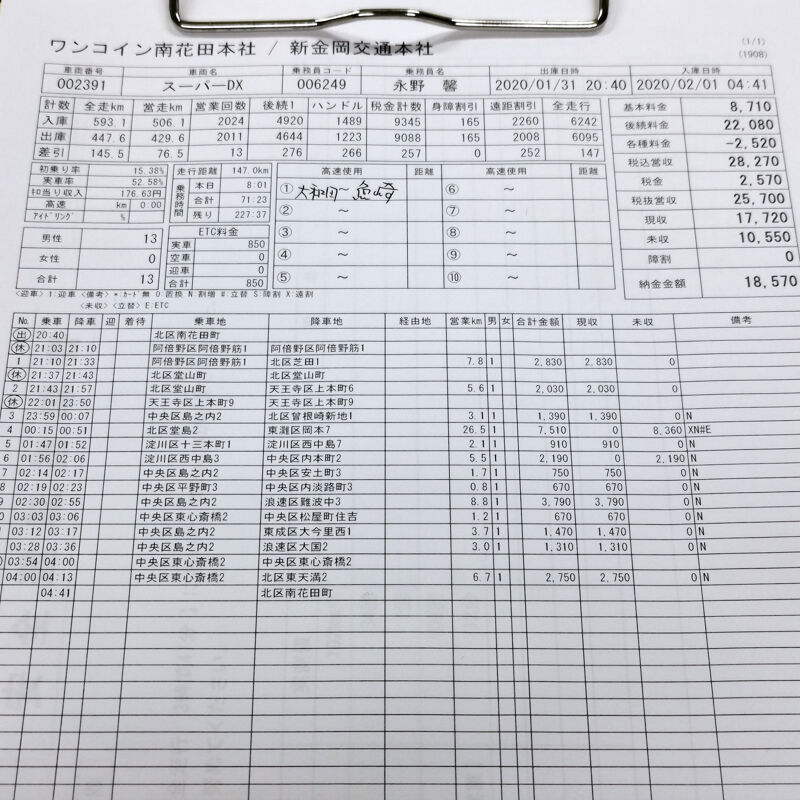 今日の売上は13組28,270円で、チップが0円やった。累計が112,140円÷4=28,035円やね。20時40分出庫の4時1分帰庫で約8時間営業。何か疲れてて、ロイホで2時間ぐらい休憩した割にはまあまあ良かった。