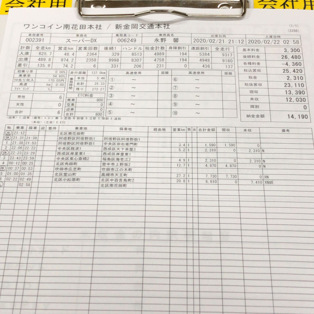 今日の売上は必殺堂山新御堂攻撃がハマって、6組25,420円で、チップが10円やった。累計は54,760円÷2=27,380円やね。出庫が21時12分、帰庫が2時58分の楽勝6時間以内営業♪ さ、帰ってブログ書こう~っと。