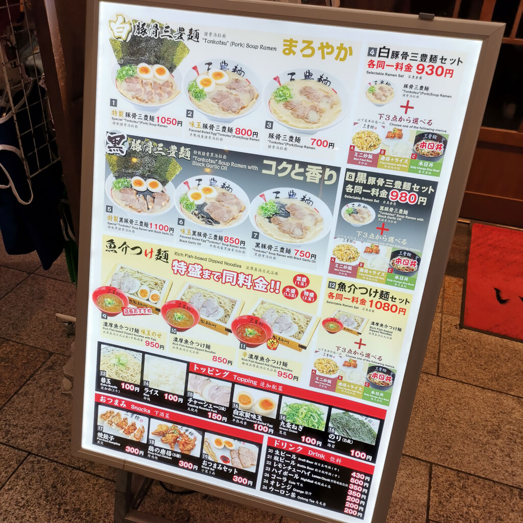 注文したのは白豚骨三豊麺、黒豚骨三豊麺やね。せっかくやから看板メニューを両方頼んで、食べ比べしてみる事にした。白はまろやかでクリーミーなカンジ。うまいわ。黒はマー油が入ってるんで、その分コクがあった。白がメッチャ良く出来てるなあ・・・!! それと店内がメッチャ綺麗やった。