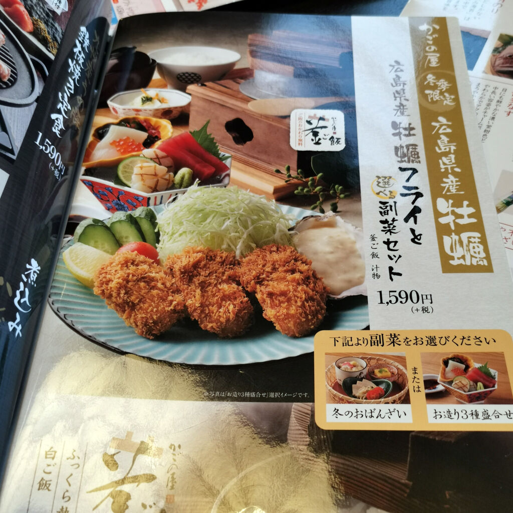 注文したのは冬季限定 広島県産牡蠣フライと選べる副菜セット1,590円。副菜は冬のおばんざいにしてみた。ご飯はおかわり自由。さすが高級ファミレスのかごの屋だけあって、味はしっかりしてた。テーブルも広い。牡蠣フライ3個はちょっと残念やった(笑)。せめて5個・・・(笑)。