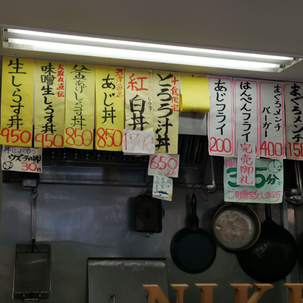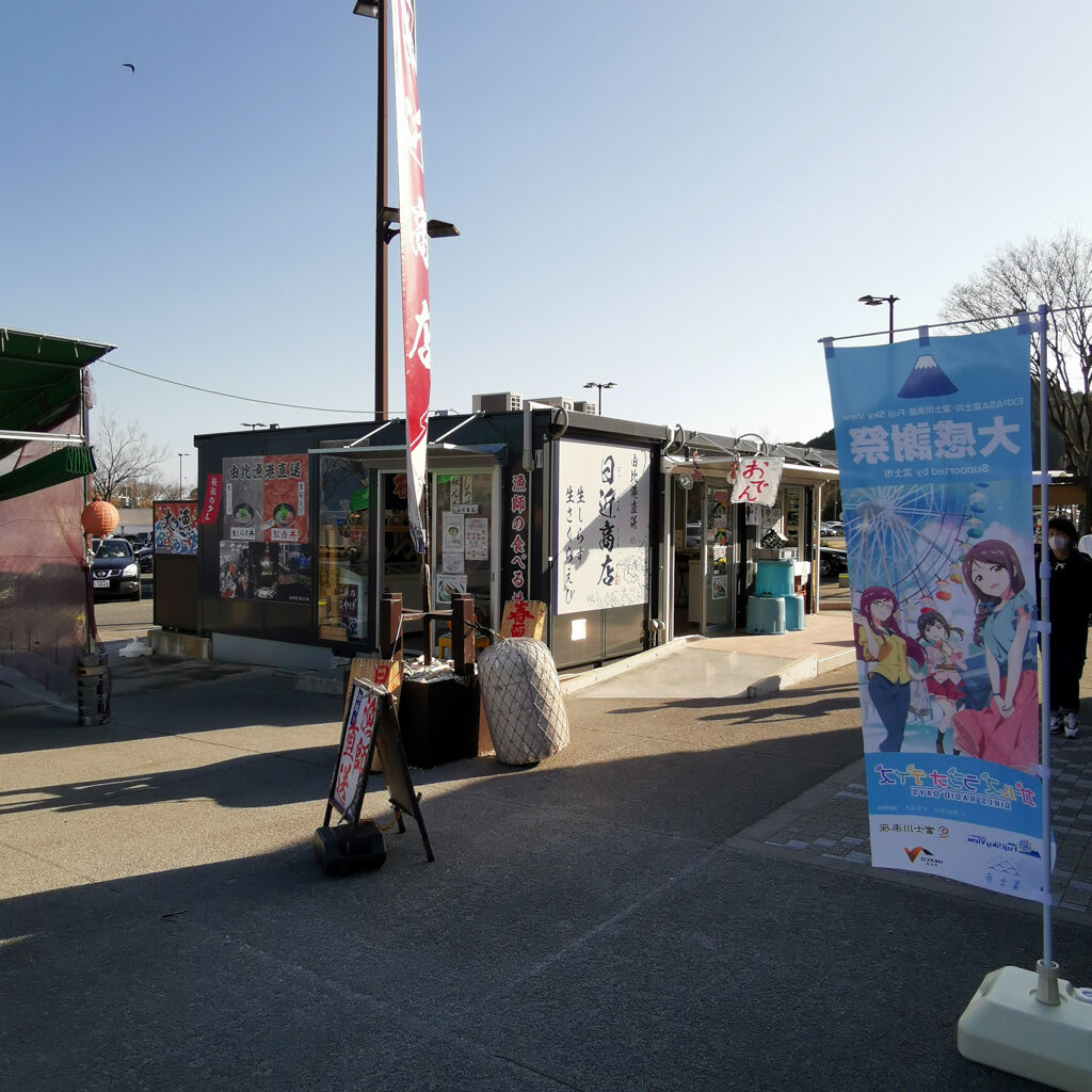 富士川SAで観覧車にも乗って、ウロウロ歩き回ってたらハラへってきた・・・。日近商店っていうお店のノボリと目が合って、ここの紅白丼っていうのを食べることにした。生しらすと生桜えびを半々に載せたスペシャル丼。