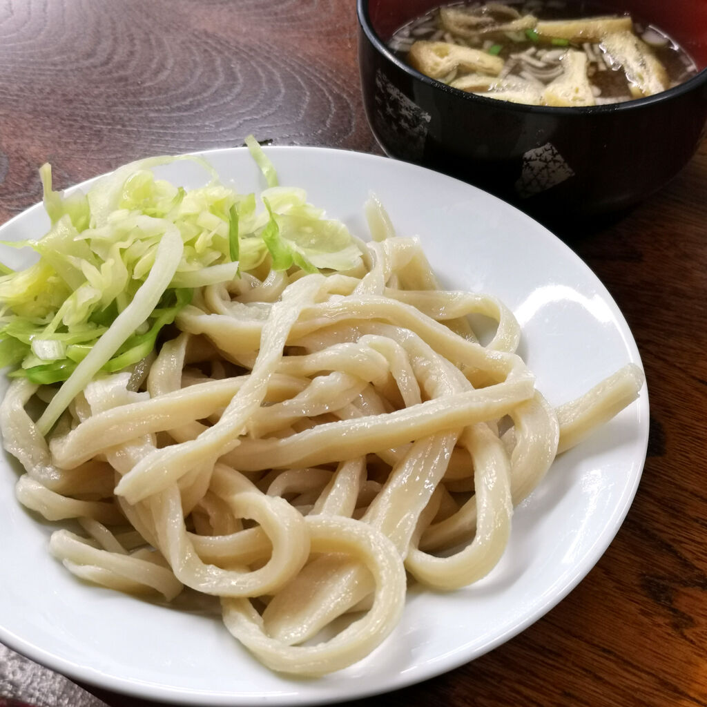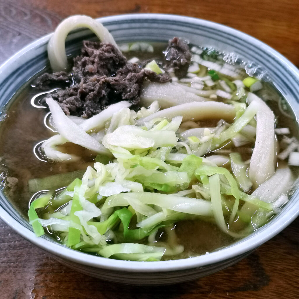 肉うどんとつけうどん冷を注文してみた。信じられへんぐらいの太うどん。こんな太いうどんが存在するんやね。さっき食べたほうとうに近い。凄い噛みごたえ。讃岐うどんとは全く性質が違う。オモロイうどんを知る事が出来た。この辺ってこういう太うどんが普通なんかもしれん。
