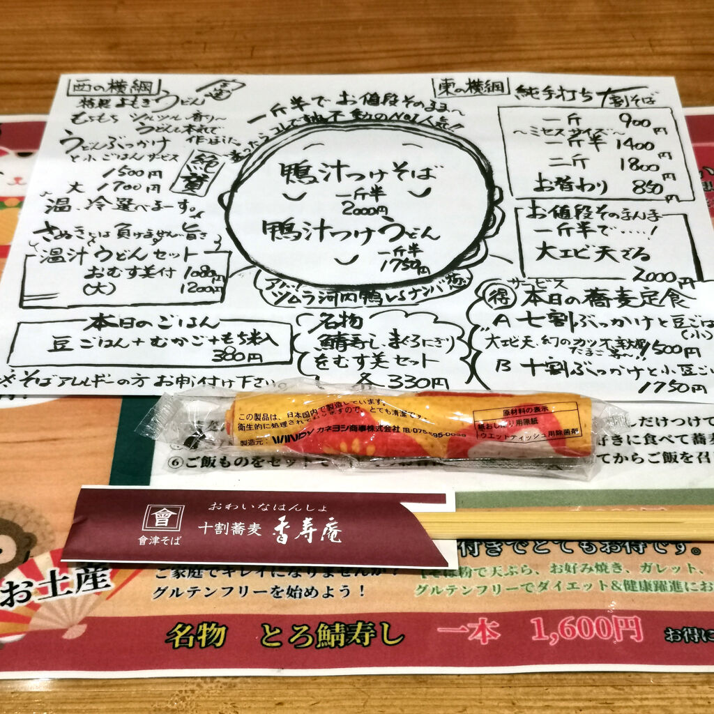 迷ったらこれの鴨汁つけそば一斤半2,000円にプラス330円で鯖寿しセット、それから大エビ天ざる一斤半2,000円。サービスで豆ごはんを出してくれはった。結論から言うとメッチャうまい。こだわりもある。鯖寿司がちょっと酢〆が控えめで実にうまかったんで、お土産でも頼んだ。ここはいい♪ 値段も味も量もちゃんとしてる。
