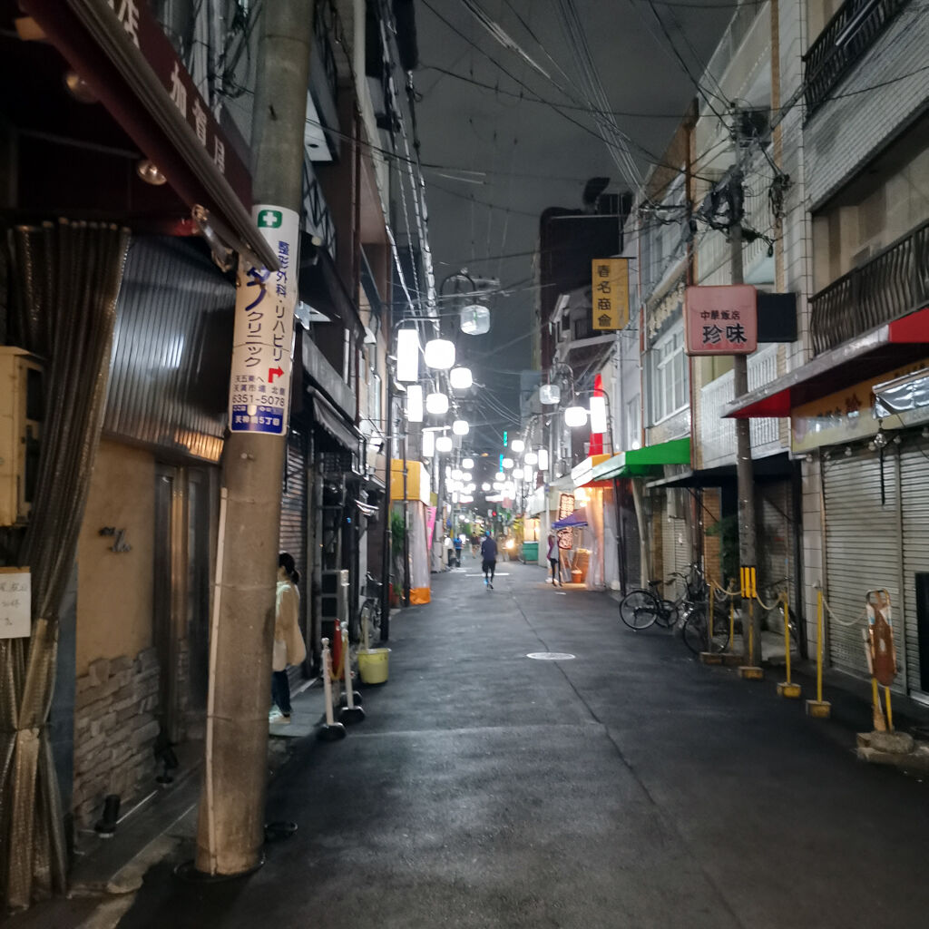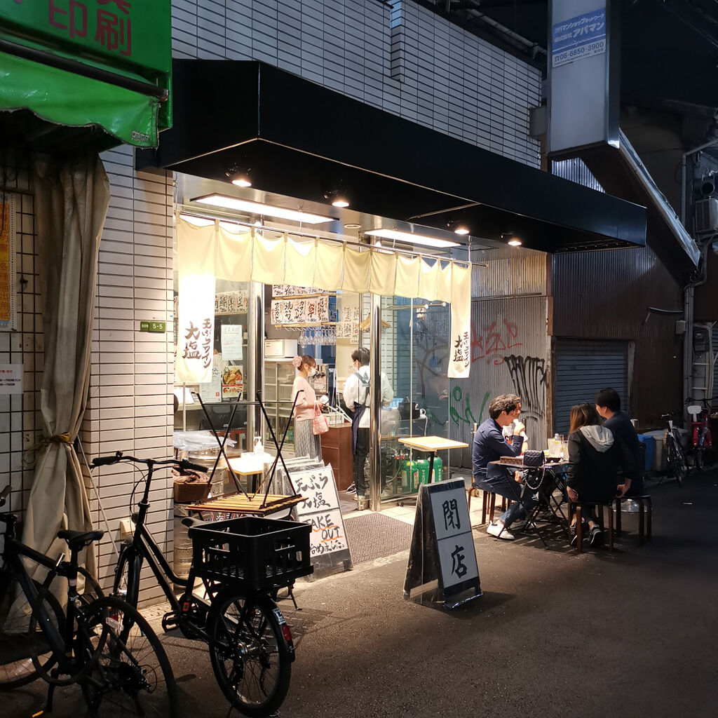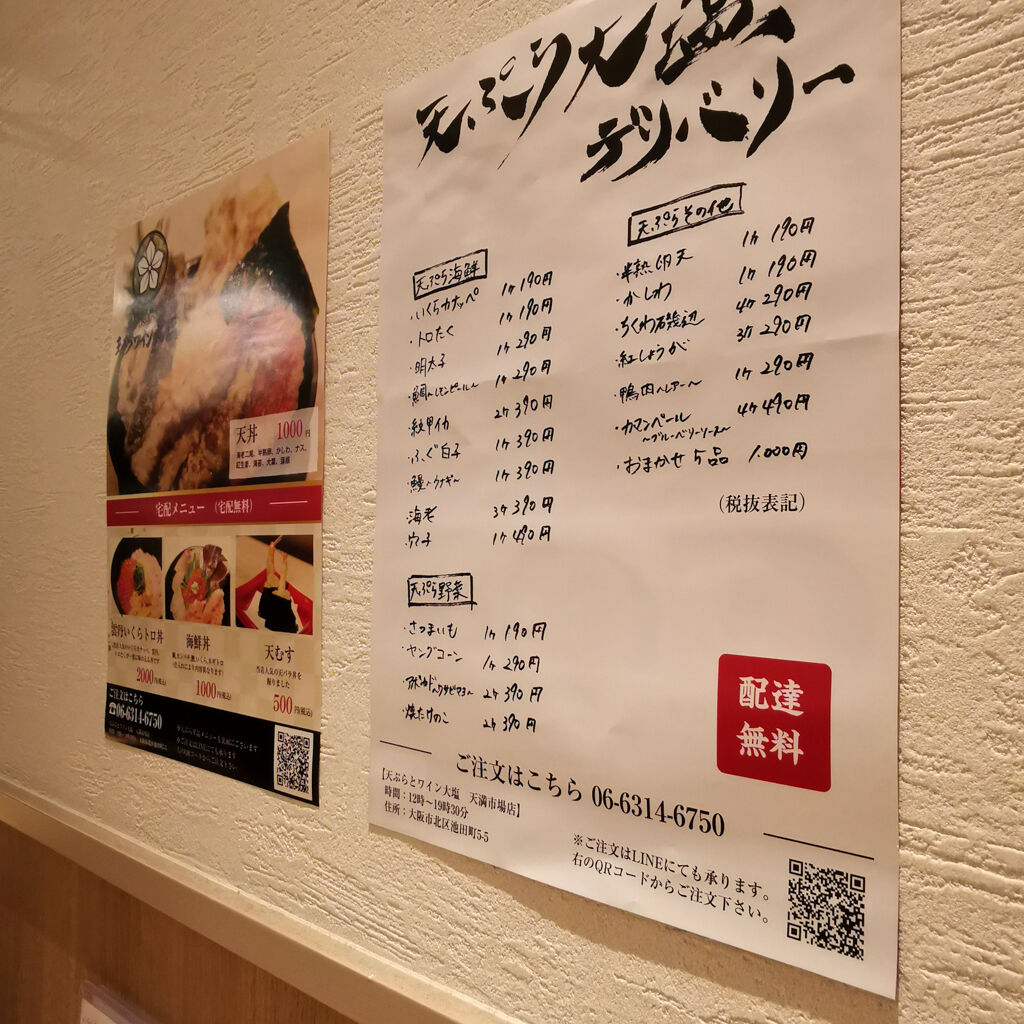 オムチャーハン食べて、せっかくなんでこの辺をブラブラしてみた。新型コロナウイルスの影響で明らかに人は少ないけど、全然おらへんワケではない。何か良さげなお店が見えてきた。天ぷらとワイン大塩 天満市場店。店内はほぼ満席。