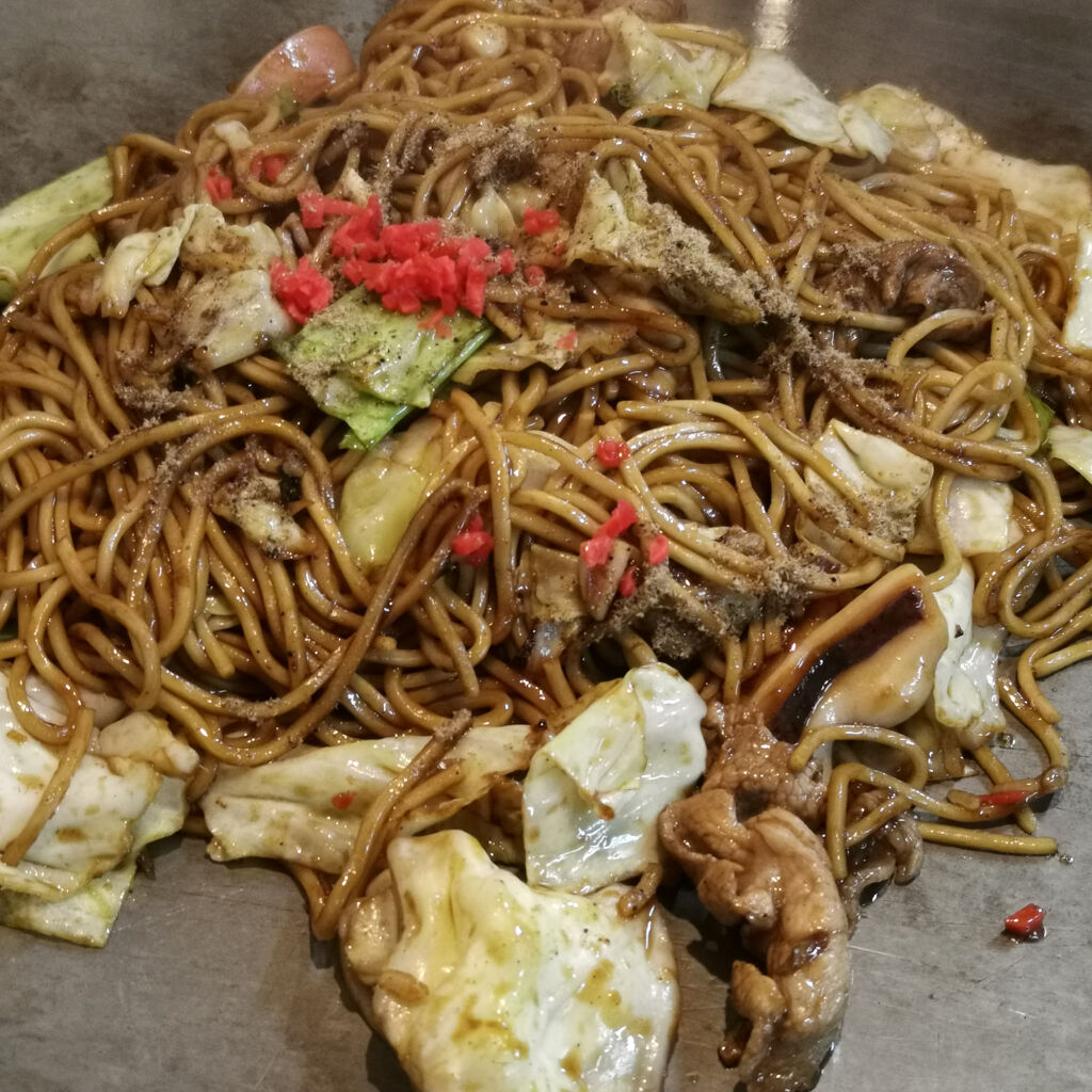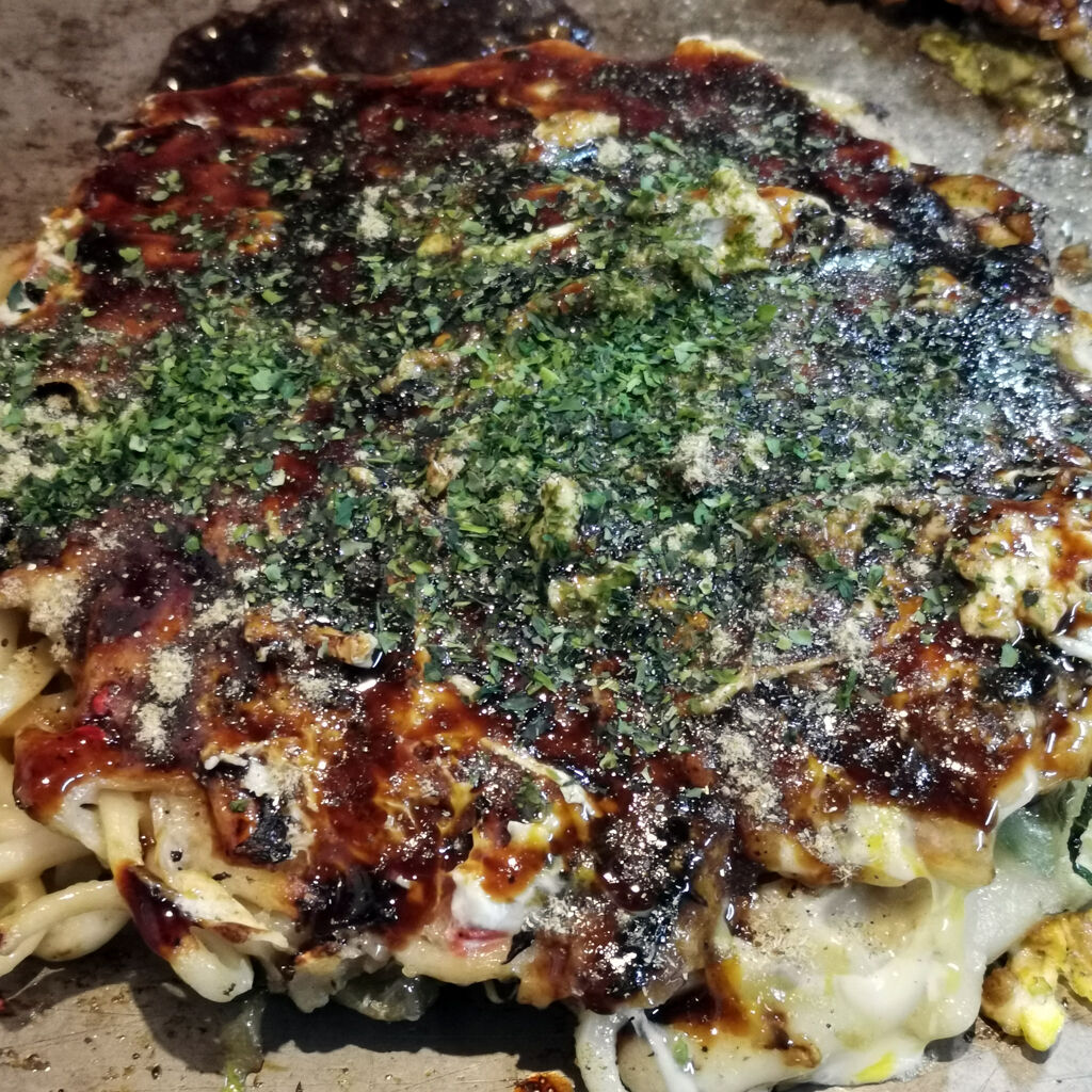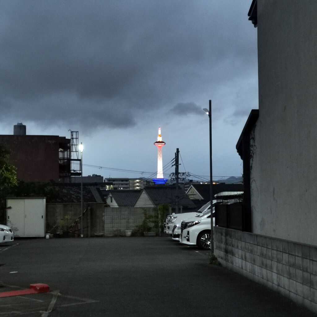 18時過ぎに入ってんけど、他にお客さんはおらへんかった。新型コロナウイルスの影響やと思う。凄い老舗。焼きそば大、オムライス、豚玉を注文。メッチャボリュームあった。しかも実にどれも良く出来てる。お好み焼き屋さんでオムライスって珍しい。近くにコインパーキングがあって、そこから京都タワーが良く見える。