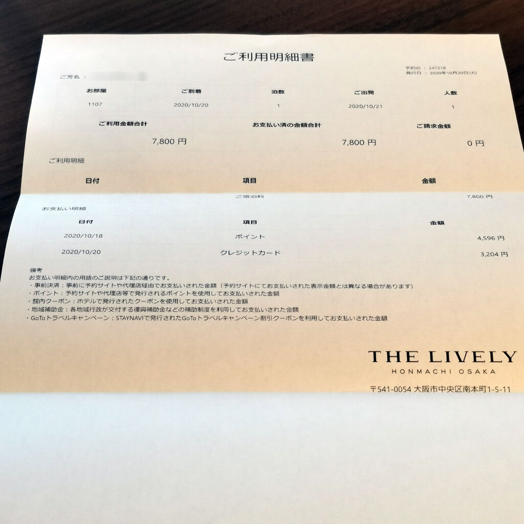 今回の明細は、基本料金7,800円、GOTOトラベルキャンペーンで-2,511円、ポイント即時利用で-819円、保有ポイント利用が-1,266Pで3,204円が支払金額。これに地域共通クーポン1,000円分がもらえるんで、実質2,204円で泊まったワケやね。保有ポイントを使えへんかったら3,470円。