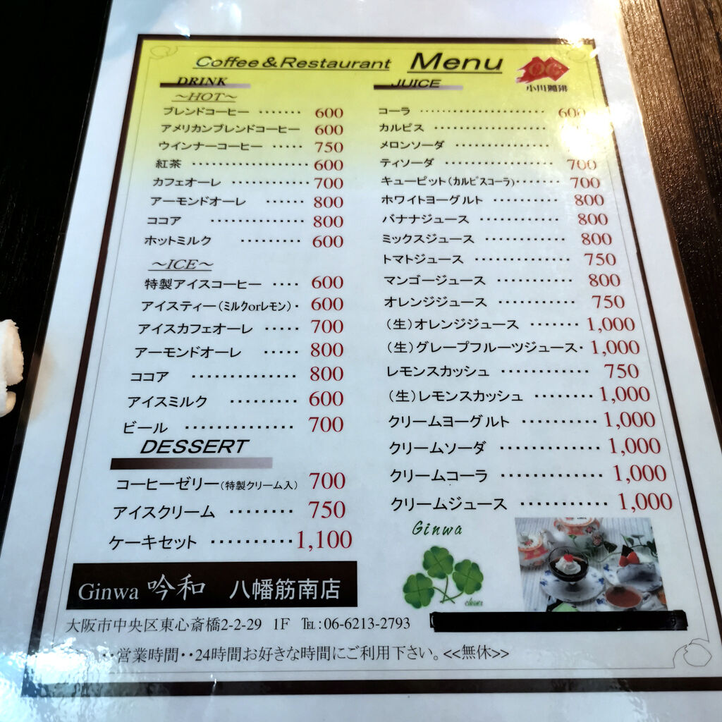 本日ラストは堺筋沿いにある吟和でミックスジュース♪ ここってずーっとやってるなあ。 2020年06月07日 02:00 本日ラストは堺筋八幡にある吟和。ここってずーっとやってるなあ。ずーっとやってて、いつ行っても誰かお客さんが居てる気がする。ここの洋食がなかなかに良く出来てる。今日は最終コーナーなんで、ミックスジュースにしてみた。800円。なかなかにいい値段するなあ。せやけど良く出来てる。ミキサーを使って作ってくれる。ここでこれを飲みながら、電話したタクシーが来るのを待ってた。今日は長い一日やったなあ。 吟和 (喫茶店 / 長堀橋駅、日本橋駅、近鉄日本橋駅) 夜総合点★★★☆☆ 3.5 ↓↓↓応援クリックよろしくお願いします 人気ブログランキング 「カフェ」カテゴリの最新記事 「大阪ミナミ」カテゴリの最新記事 タグ :#吟和#大阪グルメタクシー#ミックスジュース#深夜営業#喫茶店#カフェ#大阪外食日記#大阪食べ歩きブログ#クチコミ情報#感想レビュー < 前の記事次の記事 > コメント コメントフォーム 名前 コメント 評価する リセット リセット 顔 星 投稿する 情報を記憶