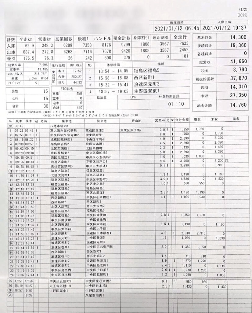 水曜日の営業。明日1月14日から2月7日まで、大阪でも緊急事態宣言が発令される事になった。2回目の緊急事態宣言。どんな街の様子になってるか、ちょっと見に出庫してみた。