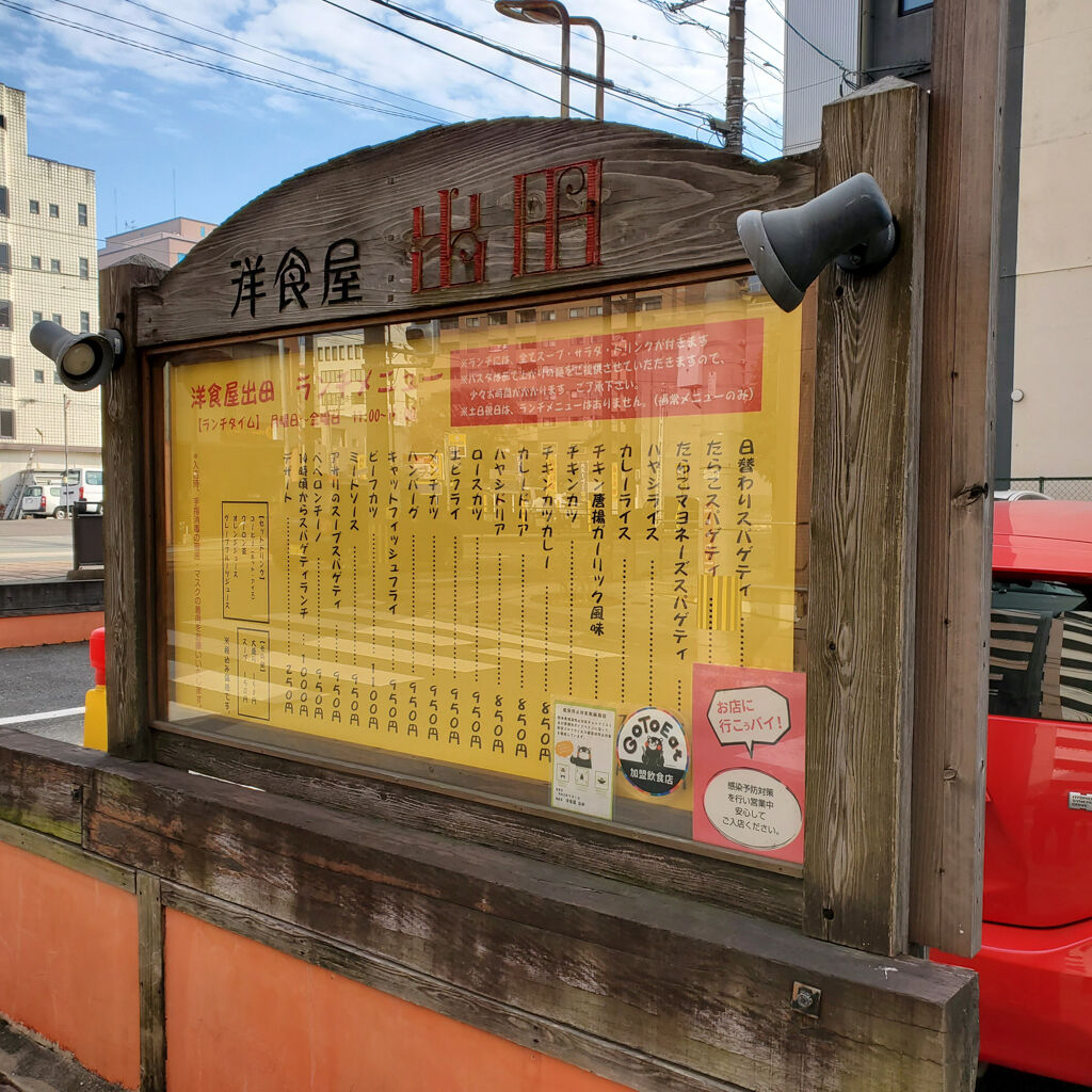 熊本食べ歩き3軒目は洋食屋出田でパスタランチ。さっきの蕎麦屋さんから徒歩ですぐのトコにあった~♪ 2020年12月10日 14:00 熊本食べ歩き3軒目は洋食屋出田。なかなかにオモロイ店名やね。ここは無料駐車場があった。オモテの看板がメッチャ味があっていい感じ。思わず入りたくなる。パスタランチ、確か1,000円ぐらいやったと思う。ドリンクも付いてる。パスタはペペロンチーノにしてみた。おっさんが作ってくれるねんけど、なかなかに上手に仕上げてあった。あっという間に無くなってんなあ。他の料理もうまそうやね~♪ 洋食屋出田 (洋食 / 慶徳校前駅、西辛島町駅、河原町駅) 昼総合点★★★☆☆ 3.7 ↓↓↓応援クリックよろしくお願いします 人気ブログランキング 「外食グルメ食べ歩き」カテゴリの最新記事 「熊本」カテゴリの最新記事 タグ :#熊本ランチ#熊本グルメ#熊本食べ歩き#洋食屋出田#パスタランチ#ペペロンチーノ#ワンドリンク#口コミ情報#感想レビュー#無料駐車場 < 前の記事次の記事 > コメント コメントフォーム 名前 コメント 評価する リセット リセット 顔 星 投稿する 情報を記憶