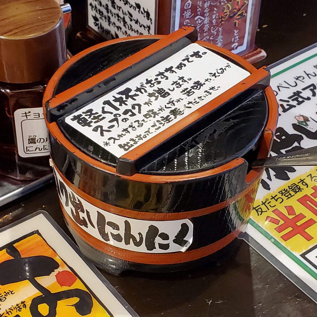 ランチタイムはライスもサービスで500円で済んだ。メッチャ安い。ラーメンは豚骨にマー油が効いたバリバリの熊本ラーメン。良く出来てる。ご飯とも良く合う味やね。カウンターに置いてあるニンニクを軽く1杯入れると、確かにスープにコクが出ていい感じになったなあ♪