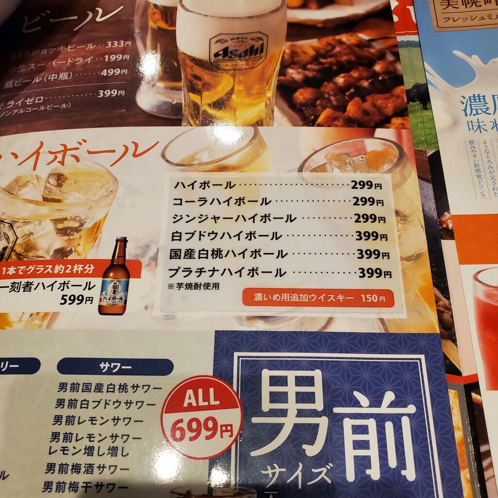 生ビール199円、ハイボール299円・・・、信じられへんぐらい安い。いくら大手チェーン店とはいえ、こんな価格設定で大丈夫なんかなあ・・・。自分でも飲食店経営やってただけに不安になる(笑)。ここの名物料理らしい清流若どりのモモ一本焼~秘伝ぷるぷるダレ~を注文してみた。