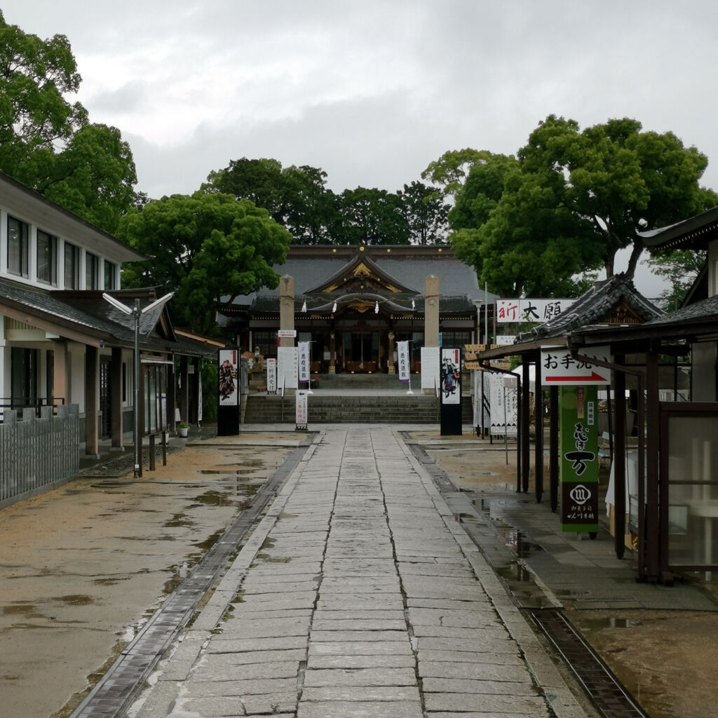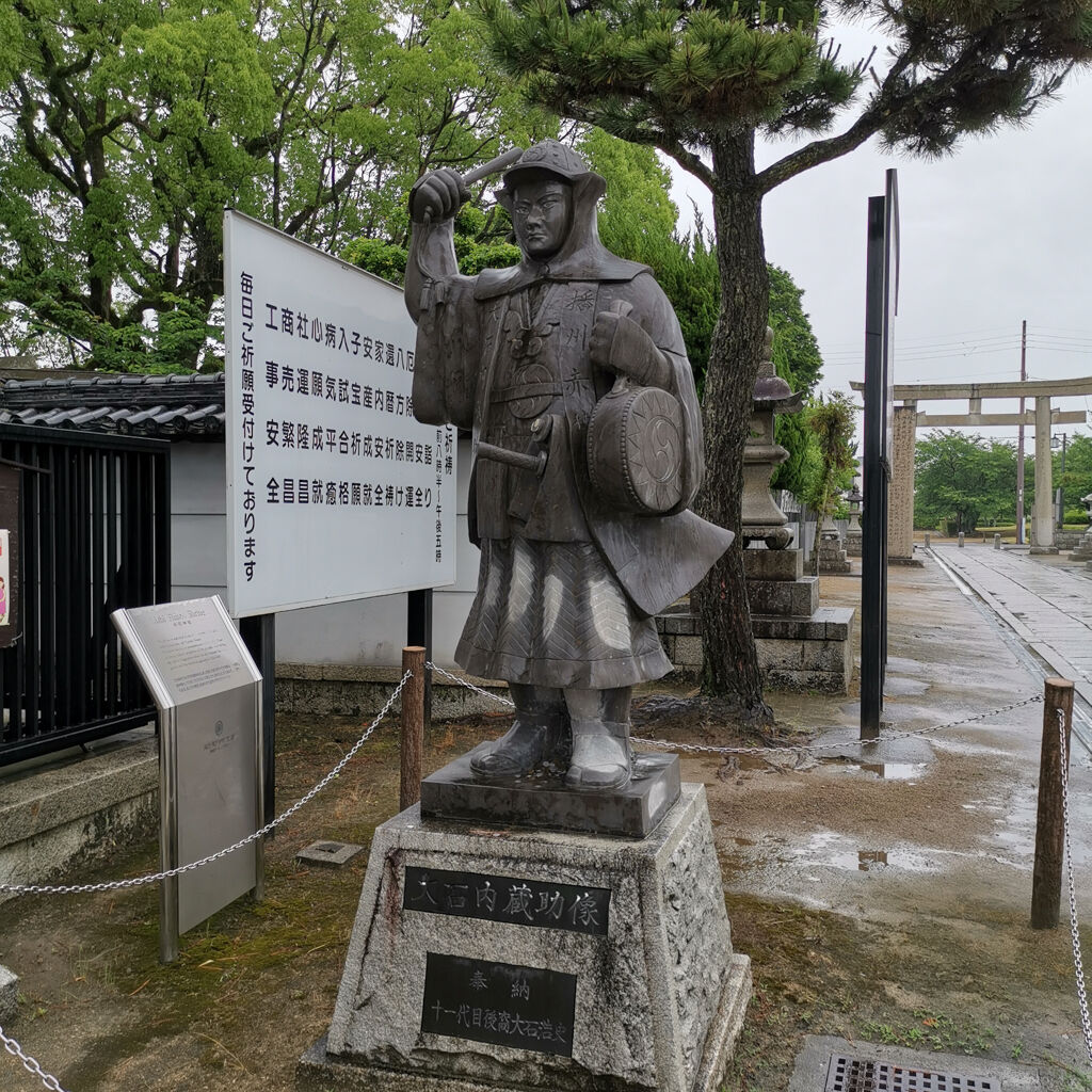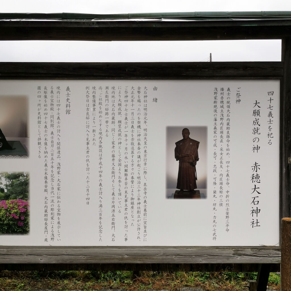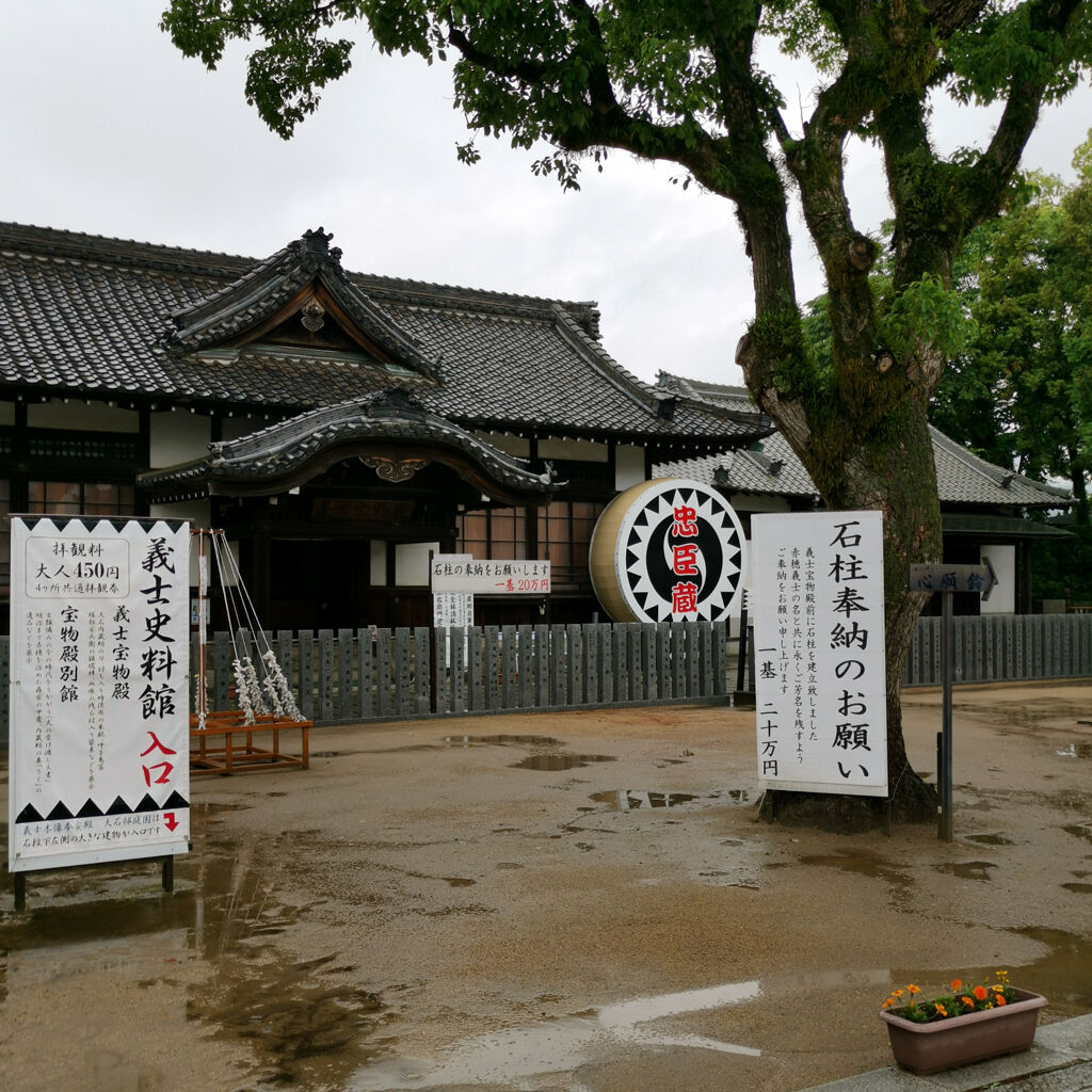雨やった。参拝客はゼロ。ここは忠臣蔵で有名な赤穂浪士を祀ってる神社やった。入り口のトコにズラッと石像が並んでるのは凄い雰囲気。今にも動きそうやね。大石内蔵助もちゃんとあった。御朱印も書いてもらえた。大願成就って書いてある。
