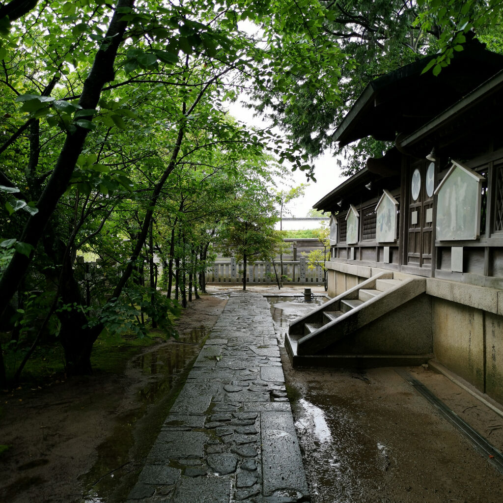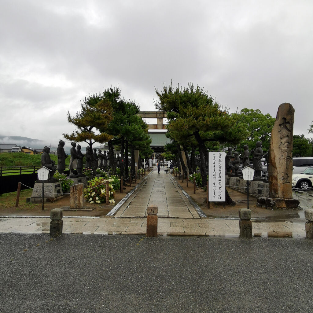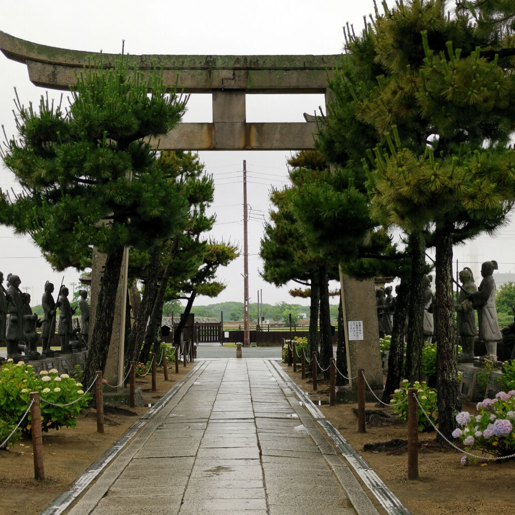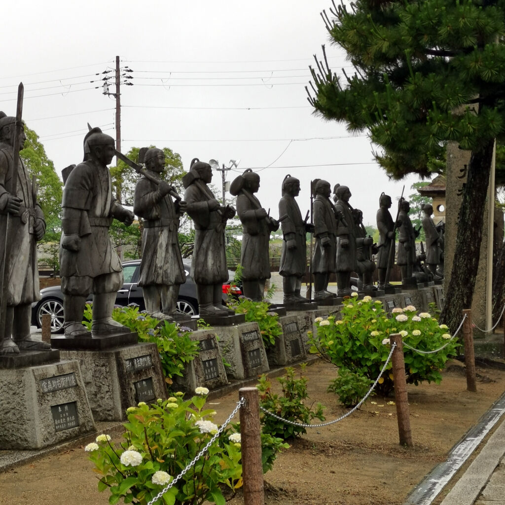 雨やった。参拝客はゼロ。ここは忠臣蔵で有名な赤穂浪士を祀ってる神社やった。入り口のトコにズラッと石像が並んでるのは凄い雰囲気。今にも動きそうやね。大石内蔵助もちゃんとあった。御朱印も書いてもらえた。大願成就って書いてある。