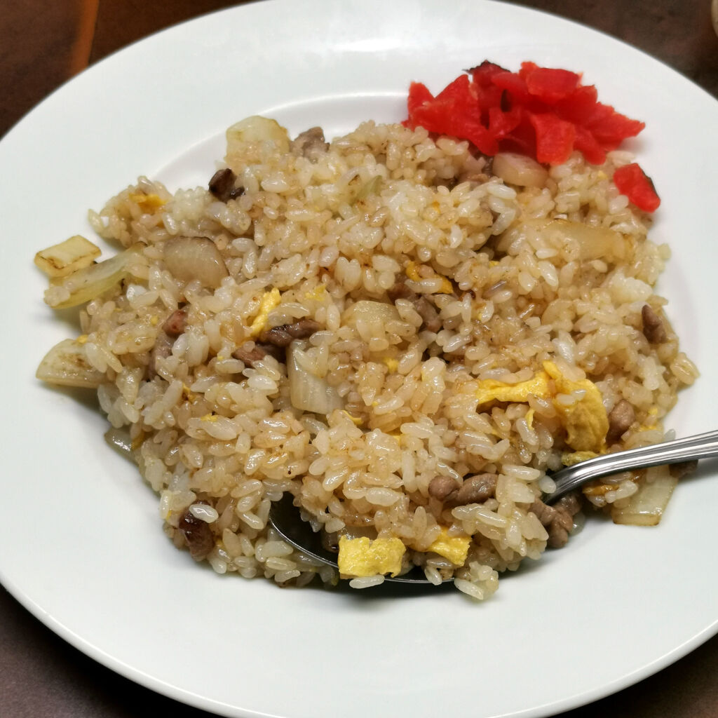 ここは豚汁が有名やねんなあ。他の料理も良く出来てる。豚汁、ヤキメシ、カツ丼を注文してみた。どれもメッチャいい感じ。やっぱり豚汁はうまいなあ。突出してる。赤だしの豚汁。ヤキメシはしっとりパラパラ、カツ丼は卵テロテロで実にいい♪