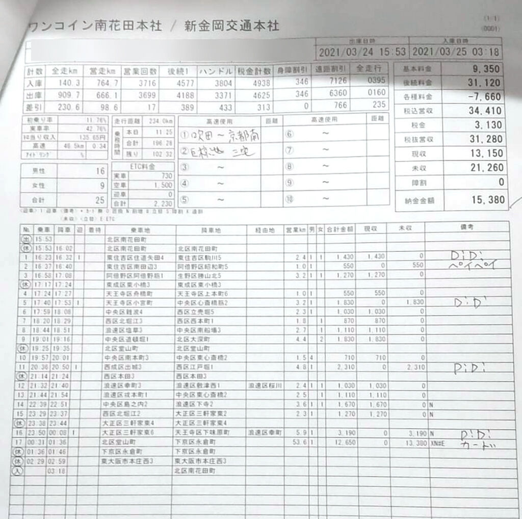 ラストは堂山から神戸三宮で、帰りは生田川から堺まで一気に高速で帰ってきた。1,320円。安いと思う。約8時間勤務の結果は、12組28,220円で、チップが300円やった。累計は28,220円÷1=28,220円やね。
