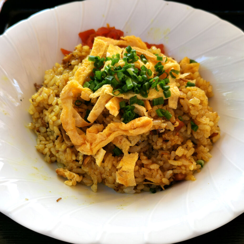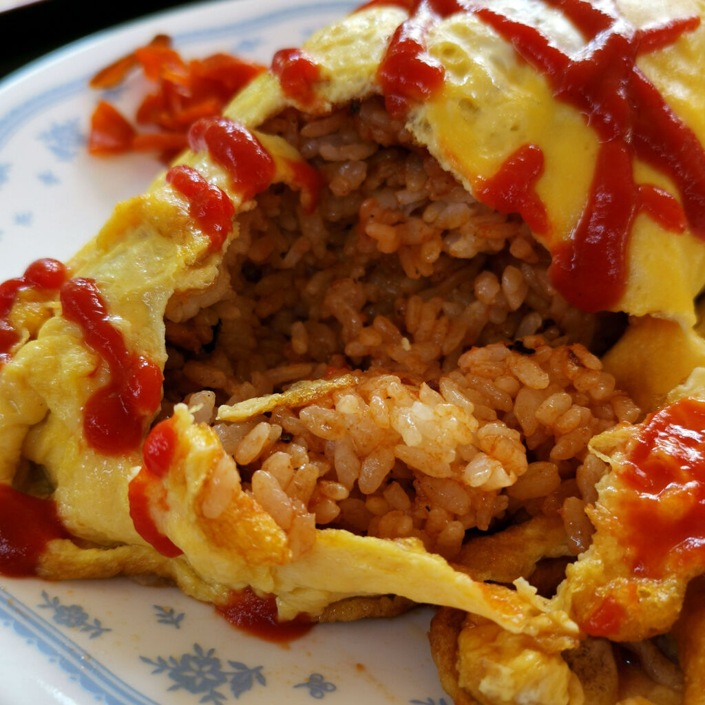 敷地の中はテラス席が無造作に展開されてる(笑)。エエやんエエやん。地元の人も普通に食べてはる。缶生のオリオンビールが300円。メッチャ安い。それとドライカレーとオムライス大盛。いやあ・・・、最高やわ。メッチャうまい。地元の人に葉っぱを教えてもらった。バナナか何かやったと思う。完全に忘れた・・・(笑)